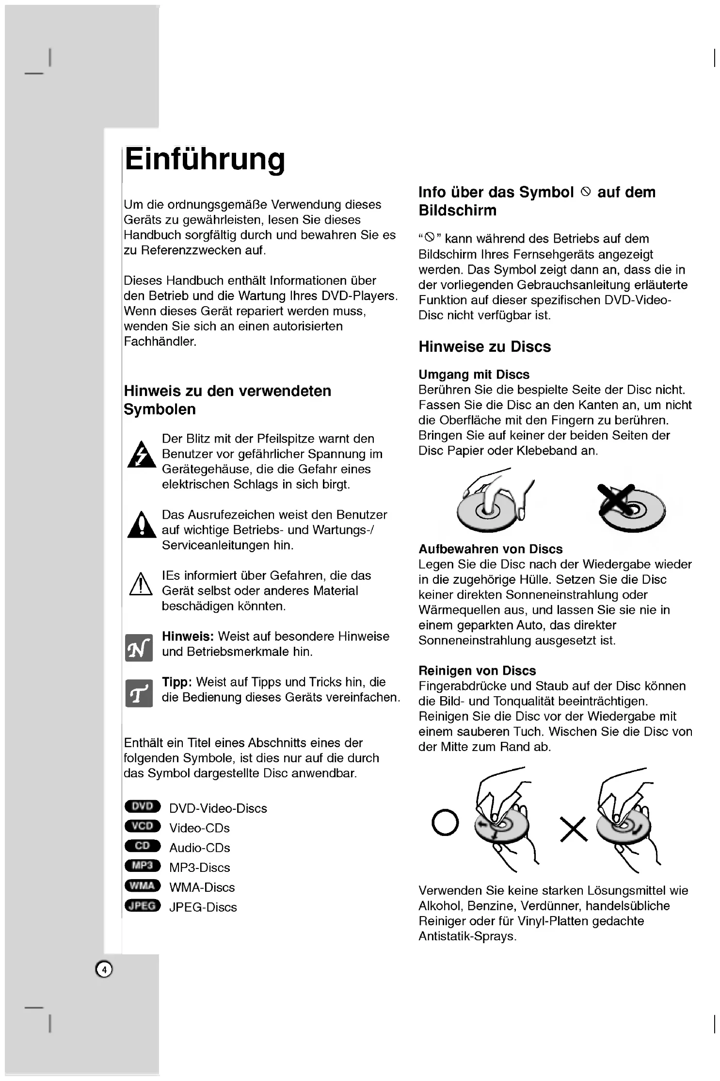 Sprachencodes........................26 Landercodes.........................27 TechnischeDaten......................284Umdie ordnungsgemaße Verwendung diesesGeratszu gewahrleisten, lesen SiediesesHandbuch sorgfaltig durchundbewahrenSieeszuReferenzzweckenauf.DiesesHandbuchenthaltInformationenuberdenBetriebunddie Wartung Ihres DVD-Players. WenndiesesGerat repariert werdenmuss,wendenSiesichaneinenautorisiertenFachhandler. Hinweis den verwendeten Symbolen DerBlitzmitder Pfeilspitze warntdenBenutzervor gefahrlicher Spannung Gerategehause, diedieGefahreineselektrischen Schlags insich birgt. DasAusrufezeichenweistdenBenutzerauf wichtige Betriebs-und Wartungs-/ Serviceanleitungen hin.IEsinformiertuber Gefahren, diedasGeratselbstoderanderesMaterial beschadigen konnten.Hinweis:WeistaufbesondereHinweiseundBetriebsmerkmalehin. Tipp: Weistauf Tipps undTricks hin, diedie Bedienung diesesGeratsvereinfachen.EnthalteinTiteleinesAbschnittseinesder folgenden Symbole, istdiesnuraufdiedurchdas Symbol dargestellte Discanwendbar.DVD-Video-DiscsVideo-CDsAudio-CDsMP3-DiscsWMA-DiscsJPEG-Discs Info uber das Symbol auf dem Bildschirm
