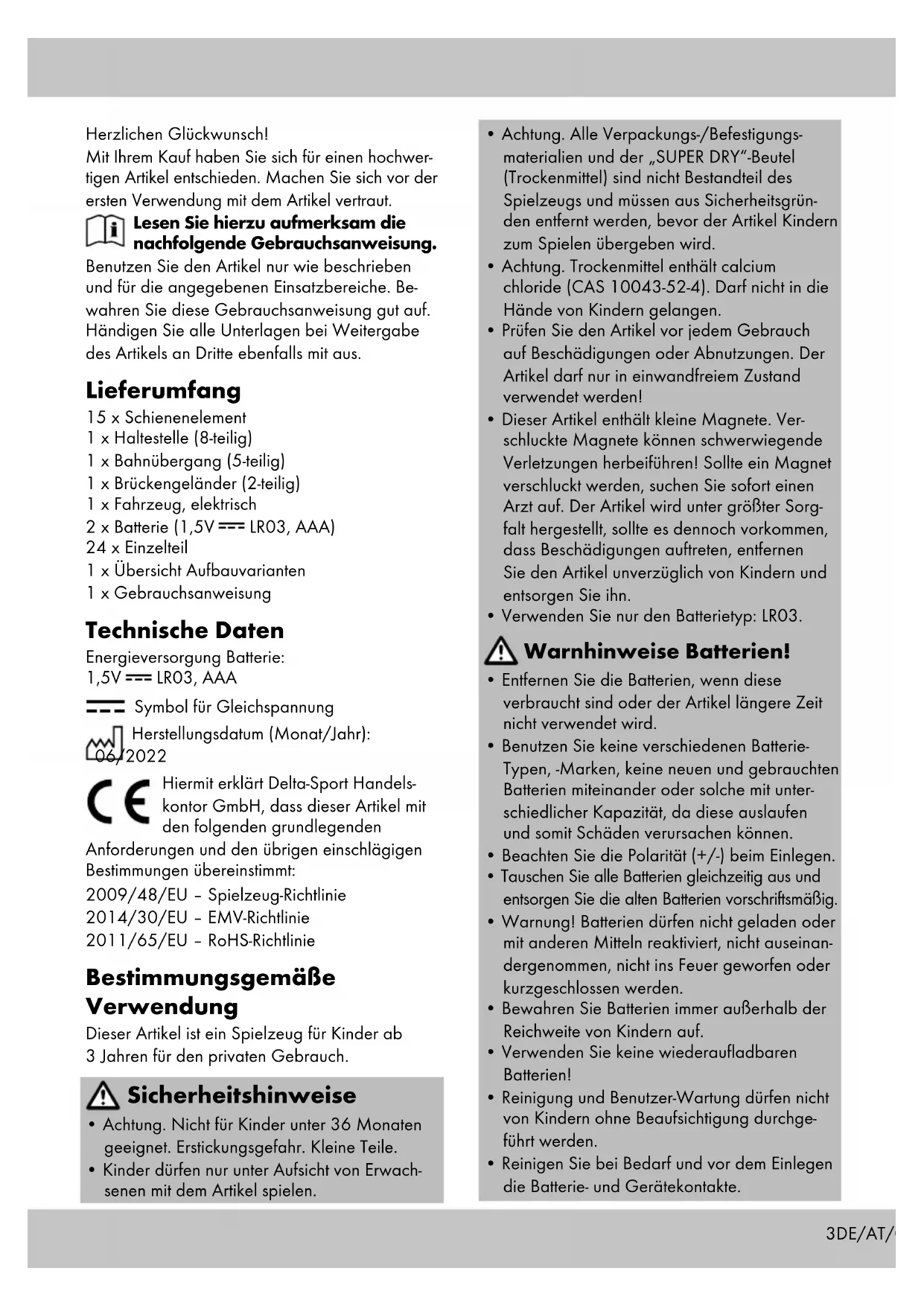 C3DE/AT/CH Herzlichen Glückwunsch! Mit Ihrem Kauf haben Sie sich für einen hochwer- tigen Artikel entschieden. Machen Sie sich vor der ersten Verwendung mit dem Artikel vertraut. Lesen Sie hierzu aufmerksam die nachfolgende Gebrauchsanweisung. Benutzen Sie den Artikel nur wie beschrieben und für die angegebenen Einsatzbereiche. Be- wahren Sie diese Gebrauchsanweisung gut auf. Händigen Sie alle Unterlagen bei Weitergabe des Artikels an Dritte ebenfalls mit aus. Lieferumfang 15 x Schienenelement 1 x Haltestelle (8-teilig) 1 x Bahnübergang (5-teilig) 1 x Brückengeländer (2-teilig) 1 x Fahrzeug, elektrisch 2 x Batterie (1,5V LR03, AAA) 24 x Einzelteil 1 x Übersicht Aufbauvarianten 1 x Gebrauchsanweisung Technische Daten Energieversorgung Batterie: 1,5V LR03, AAA Symbol für Gleichspannung Herstellungsdatum (Monat/Jahr): 06/2022 Hiermit erklärt Delta-Sport Handels- kontor GmbH, dass dieser Artikel mit den folgenden grundlegenden Anforderungen und den übrigen einschlägigen Bestimmungen übereinstimmt: 2009/48/EU – Spielzeug-Richtlinie 2014/30/EU – EMV-Richtlinie 2011/65/EU – RoHS-Richtlinie Bestimmungsgemäße Verwendung Dieser Artikel ist ein Spielzeug für Kinder ab 3 Jahren für den privaten Gebrauch. Sicherheitshinweise