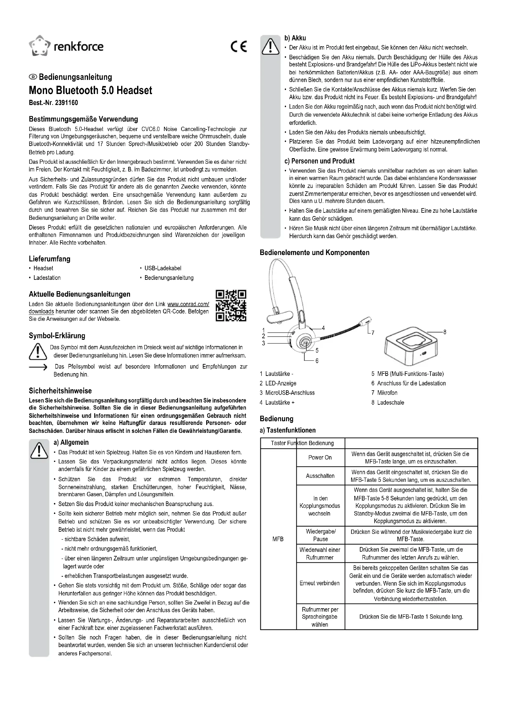 10, Mac OS X 10.1, Android 8.0, iOS 13.1, iPad OS 13.1 oder höher Schalldruckpegel.......... ................ max. 80,34 dB Bereich ......................................... 10 m Geräuschunterdrückung ............... CVC6.0 Akkuverbrauch pro Ladung .......... 17 Stunden Gespräch/Musik 200 Stunden Standby Frequenz ...................................... 2,402 - 2,480 GHz Sendeleistung ............................... max. -1,64 dBm Messbereich ................................. max. 10 m Betriebs-/Lagerbedingungen ........ 0 bis +40 °C (Betrieb) -10 bis +50 °C (Lagerung) 10 bis 85% rF (nicht kondensierend) Abmessungen (B x H x T) ............ 142 x 49 x 163 mm Gewicht ......................................... 242 g (Headset, Ladestation, Kabel) 54 g (Headset) Dies ist eine Publikation der Conrad Electronic SE, Klaus-Conrad-Str. 1, D-92240 Hirschau (www.conrad.com). Alle Rech- te einschließlich Übersetzung vorbehalten. Reproduktionen jeder Art, z. B. Fotokopie, Mikroverlmung oder die Erfassung in elektronischen Datenverarbeitungsanlagen bedürfen der schriftlichen Genehmigung des Herausgebers. Nachdruck, auch auszugsweise, verboten. Die Publikation entspricht dem technischen Stand bei Drucklegung. Copyright 2022 by Conrad Electronic SE. *2391160_V4_0122_02_dm_mh_DE• Place the product on a heat-resistant surface when the battery is charging. It is normal for the battery to heat up slightly during the charging process. c) People and product