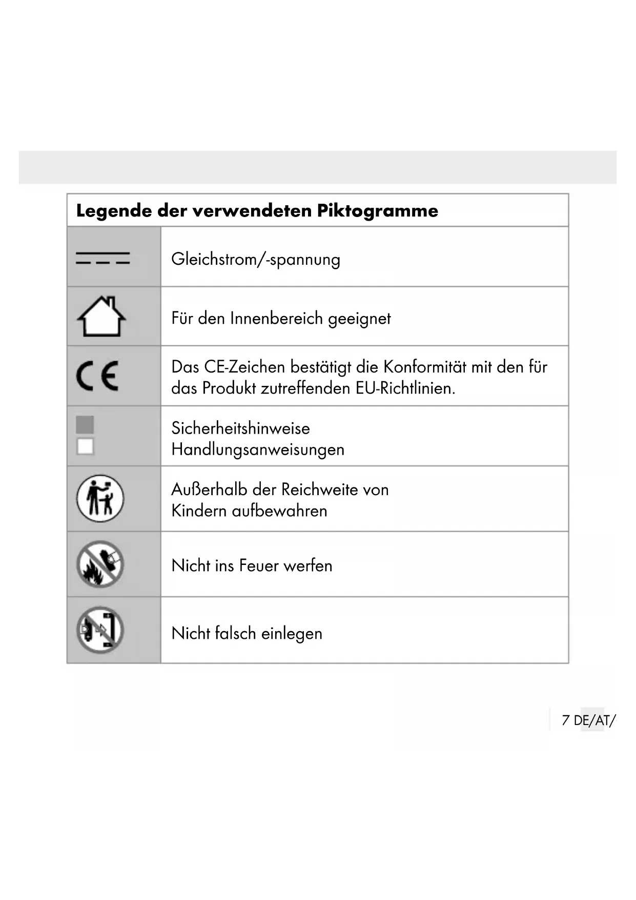 66 DE/AT/CH V2.0 Legende der verwendeten Piktogramme ..........Seite 7 Einleitung ..........................................................................................Seite 9 Bestimmungsgemäße Verwendung .....................................................Seite 10 Teilebeschreibung ................................................................................. Seite 11 Technische Daten..................................................................................Seite 11 Lieferumfang .........................................................................................Seite 12 Allgemeine Sicherheitshinweise ..................................Seite 13 Sicherheitshinweise für Batterien/Akkus .............................................Seite 15 Nicht-offen sichtliche Symptome, die durch Verschlucken von Batterien auftreten können ............................................................ Seite 18 Inbetriebnahme ..........................................................................Seite 19 Batterie/Batterien einlegen/austauschen ...........................................Seite 19 Gebrauch ..........................................................................................Seite 20 Auspusten/Anpusten ............................................................................Seite 21 Entsorgung ......................................................................................Seite 21 Garantie ............................................................................................Seite 25 Abwicklung im Garantiefall .................................................................Seite 26 Service ................................................................................................... Seite 277 DE/AT/CH Legende der verwendeten Piktogramme Gleichstrom/-spannung Für den Innenbereich geeignet Das CE-Zeichen bestätigt die Konformität mit den für das Produkt zutreffenden EU-Richtlinien. Sicherheitshinweise Handlungsanweisungen Außerhalb der Reichweite von Kindern aufbewahren Nicht ins Feuer werfen Nicht falsch einlegen8 DE/AT/CH Legende der verwendeten Piktogramme Nicht deformieren/beschädigen Nicht öffnen/auseinandernehmen Unterschiedliche Typen und Marken nicht miteinander mischen Neue und gebrauchte Batterien nicht miteinander mischen Nicht laden Halten Sie Batterien von Wasser und übermäßiger Feuchtigkeit fern. Nicht kurzschließen9 DE/AT/CH Legende der verwendeten Piktogramme Auf richtiges Einlegen achten WARNUNG! Dieses Produkt enthält eine Knopfzelle. Gefährlich bei Verschlucken – beachten Sie die Anweisungen. LED-Echtwachskerzen Einleitung Bei diesem Dokument handelt es sich um eine verkürzte Druckausgabe der vollständigen Bedienungsanleitung. Durch das Scannen des QR- Codes gelangen Sie direkt auf die Lidl-Service-Seite (www.lidl-service.com) und können durch die Eingabe der Artikelnummer (IAN) 486155_2501 die vollständige Bedienungsanleitung einsehen und herunterladen. Die Kurzanleitung ist Bestandteil dieses Produkts. Machen Sie sich vor der Benutzung des Produkts mit allen Bedien- und Sicherheitshinweisen10 DE/AT/CH vertraut. Bewahren Sie die Kurzanleitung gut auf und händigen Sie alle Unterlagen bei Weitergabe des Produkts an Dritte mit aus. Bestimmungsgemäße Verwendung Dieses Produkt ist zur Verwendung als Stimmungslicht in trockenen Innenräumen geeignet. Das Produkt ist nur für den Einsatz in privaten Haushalten und nicht für den ge- werblichen Einsatz bestimmt.11 DE/AT/CH Teilebeschreibung