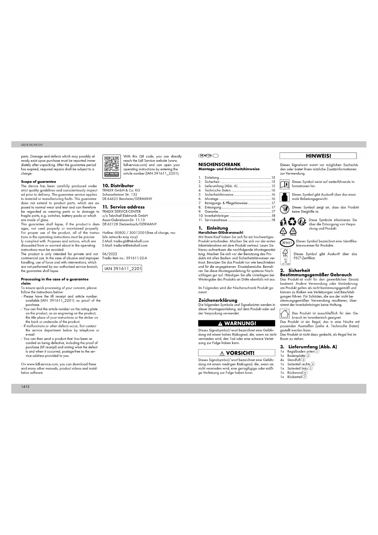 Sehr geehrte Kundin, sehr geehrter Kunde, Sie er- halten auf dieses Produkt 3 Jahre Garantie ab Kauf- datum. Im Falle von Mängeln dieses Produkts stehen Ihnen gegen den Verkäufer des Produkts gesetzliche Rechte zu. Diese gesetzlichen Rechte werden durch unsere im Folgenden dargestellte Garantie nicht ein- geschränkt.18 19 DE/AT/CH Garantiebedingungen Die Garantiefrist beginnt mit dem Kaufdatum. Bitte bewahren Sie den Original-Kassenbon gut auf. Diese Unterlage wird als Nachweis für den Kauf benötigt. Tritt innerhalb von drei Jahren ab dem Kaufdatum die- ses Produkts ein Material- oder Fabrikationsfehler auf, wird das Produkt von uns – nach unserer Wahl – für Sie kostenlos repariert oder ersetzt. Diese Garantie- leistung setzt voraus, dass innerhalb der Drei-Jahres- Frist das defekte Produkt und der Kaufbeleg (Kassen- bon) vorgelegt und schriftlich kurz beschrieben wird, worin der Mangel besteht und wann er aufgetreten ist. Wenn der Defekt von unserer Garantie gedeckt ist, erhalten Sie das reparierte oder ein neues Produkt zurück. Mit Reparatur oder Austausch des Produkts beginnt kein neuer Garantiezeitraum. Garantiezeit und gesetzliche Mängelan- sprüche Die Garantiezeit wird durch die Gewährleistung nicht verlängert. Dies gilt auch für ersetzte und repa- rierte Teile. Eventuell schon beim Kauf vorhandene Schäden und Mängel müssen sofort nach dem Aus- packen gemeldet werden. Nach Ablauf der Garan- tiezeit anfallende Reparaturen sind kostenpflichtig. Garantieumfang Das Produkt wurde nach strengen Qualitätsrichtlini- en sorgfältig produziert und vor Anlieferung gewis- senhaft geprüft. Die Garantieleistung gilt für Materi- al- oder Fabrikationsfehler. Diese Garantie erstreckt sich nicht auf Produktteile, die normaler Abnutzung ausgesetzt sind und daher als Verschleißteile ange- sehen werden können oder für Beschädigungen an zerbrechlichen Teilen, z. B. Schalter, Akkus oder die aus Glas gefertigt sind. Diese Garantie verfällt, wenn das Produkt beschä- digt, nicht sachgemäß benutzt oder gewartet wurde. Für eine sachgemäße Benutzung des Produkts sind alle in der Anleitung aufgeführten Anweisungen ge- nau einzuhalten. Verwendungszwecke und Handlun- gen, von denen in der Anleitung abgeraten oder vor denen gewarnt wird, sind unbedingt zu vermeiden. Das Produkt ist lediglich für den privaten und nicht für den gewerblichen Gebrauch bestimmt. Bei miss- bräuchlicher und unsachgemäßer Behandlung, Ge- waltanwendung und bei Eingriffen, die nicht von unserer autorisierten Service-Niederlassung vorge- nommen wurden, erlischt die Garantie. Abwicklung im Garantiefall Um eine schnelle Bearbeitung Ihres Anliegens zu ge- währleisten, folgen Sie bitte den folgenden Hinweisen: - Bitte halten Sie für alle Anfragen den Kassenbon und die Artikelnummer (IAN 391611_2201) als Nachweis für den Kauf bereit. - Die Artikelnummer entnehmen Sie bitte dem Ty- penschild am Produkt, einer Gravur am Produkt, dem Titelblatt Ihrer Anleitung oder dem Aufkleber auf der Rück- oder Unterseite des Produkts. - Sollten Funktionsfehler oder sonstige Mängel auf- treten, kontaktieren Sie zunächst die nachfolgend benannte Serviceabteilung telefonisch oder per E-Mail. - Ein als defekt erfasstes Produkt können Sie dann unter Beifügung des Kaufbelegs (Kassenbon) und der Angabe, worin der Mangel besteht und wann er aufgetreten ist, für Sie portofrei an die Ihnen mitgeteilte Serviceadresse übersenden. Auf www.lidl-service.com können Sie dieses und vie- le weitere Handbücher, Produktvideos und Installati- onssoftware herunterladen. Mit diesem QR-Code gelangen Sie direkt auf die Lidl-Service-Seite (www. lidl-service.com) und können mittels der Eingabe der Artikelnummer (IAN 391611_2201) Ihre Anleitung öffnen.