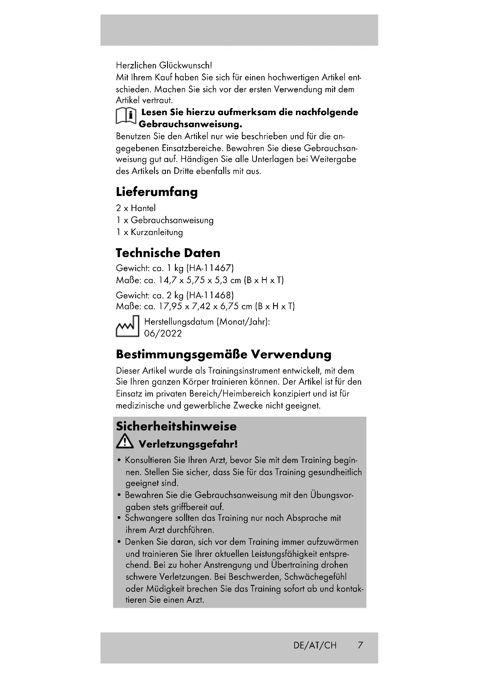 Wichtig: Achten Sie darauf, dass Ihre Oberschenkel parallel nebeneinander bleiben. Das Becken schieben Sie dabei nach vorne, der Oberkörper bleibt aufge- richtet. Lagerung, Reinigung Lagern Sie den Artikel bei Nichtbenutzung immer trocken und sauber bei Raumtemperatur. Nur mit einem feuchten Reinigungs- tuch reinigen und anschließend trockenwischen. WICHTIG! Nie mit scharfen Reinigungsmitteln reinigen. Hinweise zur Entsorgung Entsorgen Sie den Artikel und die Verpackungsmaterialien entspre- chend den aktuellen örtlichen Vorschriften. Verpackungsmateriali- en, wie z. B. Folienbeutel, gehören nicht in Kinderhände. Bewahren Sie das Verpackungsmaterial für Kinder unerreichbar auf. Entsorgen Sie den Artikel und die Verpackung umwelt- schonend. Der Recycling-Code dient der Kennzeichnung verschiede- ner Materialien zur Rückführung in den Wiederverwer- tungskreislauf (Recycling). Der Code besteht aus dem Recyclingsymbol – das den Verwertungskreislauf widerspiegeln soll – und einer Nummer, die das Material kennzeichnet. Hinweise zur Garantie und Serviceabwicklung Der Artikel wurde mit großer Sorgfalt und unter ständiger Kontrolle produziert. DELTA-SPORT HANDELSKONTOR GmbH räumt privaten Endkunden auf diesen Artikel drei Jahre Garantie ab Kaufdatum (Garantiefrist) nach Maßgabe der folgenden Be- stimmungen ein. Die Garantie gilt nur für Material- und Verarbei- tungsfehler. Die Garantie erstreckt sich nicht auf Teile, die der normalen Abnutzung unterliegen und deshalb als Verschleißteile anzusehen sind (z. B. Batterien) sowie nicht auf zerbrechliche Teile, z. B. Schalter, Akkus oder Teile, die aus Glas gefertigt sind. DE/AT/CH11 Ansprüche aus dieser Garantie sind ausgeschlossen, wenn der Artikel unsachgemäß oder missbräuchlich oder nicht im Rahmen der vorgesehenen Bestimmung oder des vorgesehenen Nutzungsumfangs verwendet wurde oder Vorgaben in der An- leitung/Anweisung nicht beachtet wurden, es sei denn, der End- kunde weist nach, dass ein Material- oder Verarbeitungsfehler vorliegt, der nicht auf einem der vorgenannten Umstände beruht. Ansprüche aus der Garantie können nur innerhalb der Garantie- frist unter Vorlage des Originalkassenbelegs geltend gemacht werden. Bitte bewahren Sie deshalb den Originalkassenbeleg auf. Die Garantiefrist wird durch etwaige Reparaturen aufgrund der Ga- rantie, gesetzlicher Gewährleistung oder Kulanz nicht verlängert. Dies gilt auch für ersetzte und reparierte Teile. Bitte wenden Sie sich bei Beanstandungen zunächst an die untenstehende Service-Hotline oder setzen Sie sich per E-Mail mit uns in Verbindung. Liegt ein Garantiefall vor, wird der Artikel von uns – nach unserer Wahl – für Sie kostenlos repariert, ersetzt oder der Kaufpreis erstattet. Weitere Rechte aus der Garantie bestehen nicht. Ihre gesetzlichen Rechte, insbesondere Gewährleistungsansprü- che gegenüber dem jeweiligen Verkäufer, werden durch diese Garantie nicht eingeschränkt. IAN: 391390_2201 Kundenservice Deutschland Tel.: 0800-5435111 E-Mail: deltasport@lidl.de Service Österreich Tel.: 0820 201 222 (0,15 EUR/Min.) E-Mail: deltasport@lidl.at Service Schweiz Tel.: 0800 56 44 33 E-Mail: deltasport@lidl.ch DE/AT/CH12 Congratulations! You have chosen to purchase a high-quality product. Familiarise yourself with the product before using it for the first time. Read the following instructions for use carefully. Use the product only as described and only for the given areas of application. Store these instructions for use carefully. When passing the product on to third parties, please also hand over all accompanying documents. Package contents 2 x dumbbell 1 x instructions for use 1 x quick guide Technical data Weight: approx. 1kg (HA-11467) Dimensions: approx. 14.7 x 5.75 x 5.3cm (W x H x D) Weight: approx. 2kg (HA-11468) Dimensions: approx. 17.95 x 7.42 x 6.75cm (W x H x D) Date of manufacture (month/year): 06/2022 Intended use This product was developed as exercise equipment to provide you with a full-body workout. The product is intended for private/ home use and is not suitable for medical or commercial use. Safety information Risk of injury!