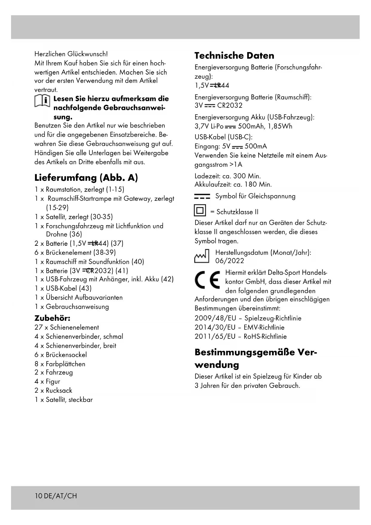 CR2032 Energieversorgung Akku (USB-Fahrzeug): 3,7V Li-Po 500mAh, 1,85Wh USB-Kabel (USB-C): Eingang: 5V 500mA Verwenden Sie keine Netzteile mit einem Aus- gangsstrom >1A Ladezeit: ca. 300 Min. Akkulaufzeit: ca. 180 Min. Symbol für Gleichspannung = Schutzklasse II Dieser Artikel darf nur an Geräten der Schutz- klasse II angeschlossen werden, die dieses Symbol tragen. Herstellungsdatum (Monat/Jahr): 06/2022 Hiermit erklärt Delta-Sport Handels- kontor GmbH, dass dieser Artikel mit den folgenden grundlegenden Anforderungen und den übrigen einschlägigen Bestimmungen übereinstimmt: 2009/48/EU – Spielzeug-Richtlinie 2014/30/EU – EMV-Richtlinie 2011/65/EU – RoHS-Richtlinie Bestimmungsgemäße Ver- wendung Dieser Artikel ist ein Spielzeug für Kinder ab 3 Jahren für den privaten Gebrauch.11 Sicherheitshinweise