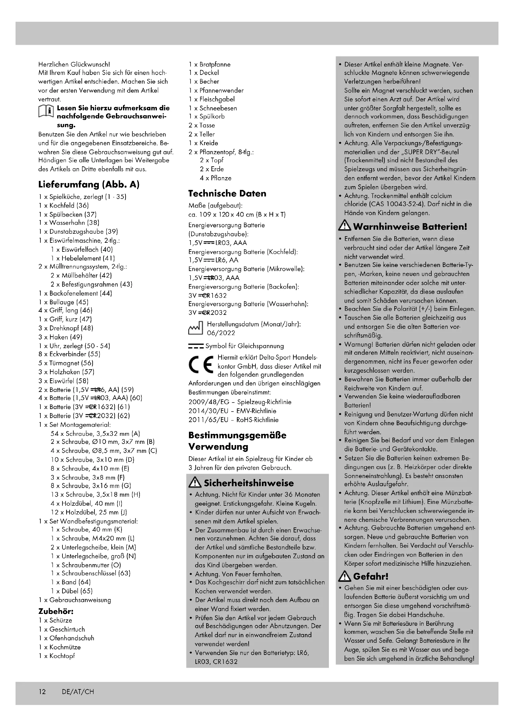 Energieversorgung Batterie (Backofen): 3V CR1632 Energieversorgung Batterie (Wasserhahn): 3V CR2032 Herstellungsdatum (Monat/Jahr): 06/2022 Symbol für Gleichspannung Hiermit erklärt Delta-Sport Handels- kontor GmbH, dass dieser Artikel mit den folgenden grundlegenden Anforderungen und den übrigen einschlägigen Bestimmungen übereinstimmt: 2009/48/EG – Spielzeug-Richtlinie 2014/30/EU – EMV-Richtlinie 2011/65/EU – RoHS-Richtlinie Bestimmungsgemäße Verwendung Dieser Artikel ist ein Spielzeug für Kinder ab 3 Jahren für den privaten Gebrauch. Sicherheitshinweise