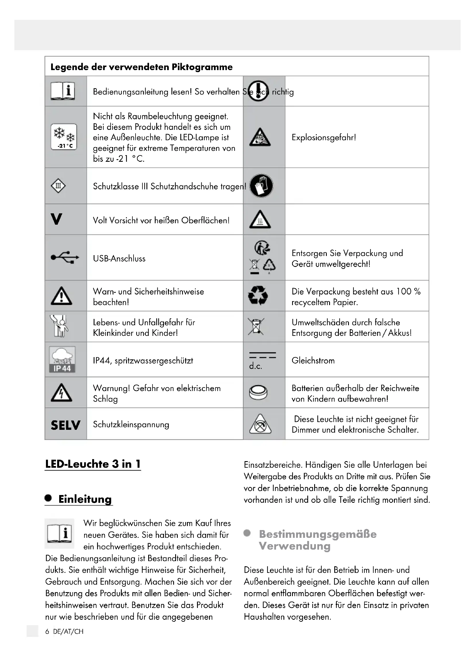 These Leuchte ist für den Betrieb im Innen- und Außenbereich geeignet. Die Leuchte kann auf allen normal entflammbaren Oberflächen befestigt werden. These Gesätigkeit ist nur für den Einsatz in privaten Haushalten vorgesehen.