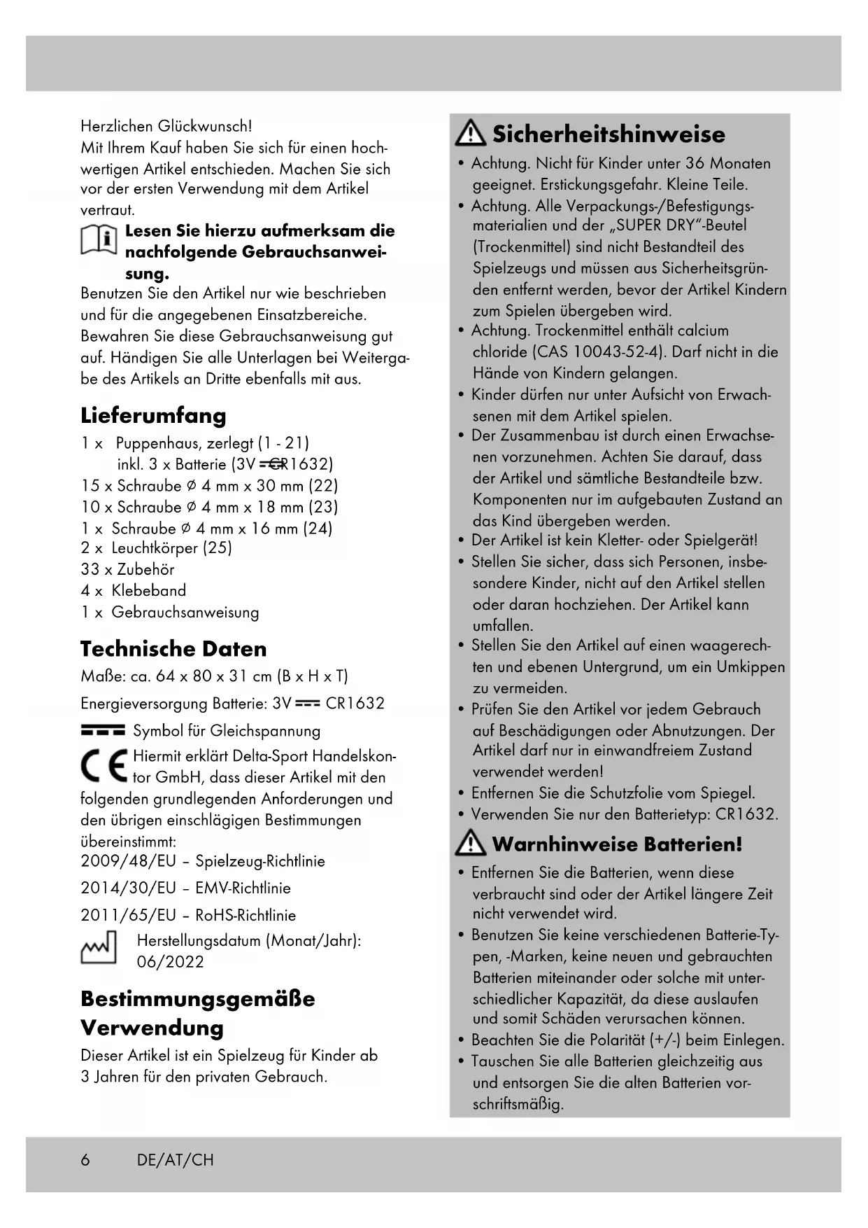 20a 20b 20c 25a 25b 25c6 Herzlichen Glückwunsch! Mit Ihrem Kauf haben Sie sich für einen hoch- wertigen Artikel entschieden. Machen Sie sich vor der ersten Verwendung mit dem Artikel vertraut. Lesen Sie hierzu aufmerksam die nachfolgende Gebrauchsanwei- sung. Benutzen Sie den Artikel nur wie beschrieben und für die angegebenen Einsatzbereiche. Bewahren Sie diese Gebrauchsanweisung gut auf. Händigen Sie alle Unterlagen bei Weiterga- be des Artikels an Dritte ebenfalls mit aus. Lieferumfang 1 x Puppenhaus, zerlegt (1 - 21) inkl. 3 x Batterie (3V CR1632) 15 x Schraube ∅ 4 mm x 30 mm (22) 10 x Schraube ∅ 4 mm x 18 mm (23) 1 x Schraube ∅ 4 mm x 16 mm (24) 2 x Leuchtkörper (25) 33 x Zubehör 4 x Klebeband 1 x Gebrauchsanweisung Technische Daten Maße: ca. 64 x 80 x 31 cm (B x H x T) Energieversorgung Batterie: 3V CR1632 Symbol für Gleichspannung Hiermit erklärt Delta-Sport Handelskon- tor GmbH, dass dieser Artikel mit den folgenden grundlegenden Anforderungen und den übrigen einschlägigen Bestimmungen übereinstimmt: 2009/48/EU – Spielzeug-Richtlinie 2014/30/EU – EMV-Richtlinie 2011/65/EU – RoHS-Richtlinie Herstellungsdatum (Monat/Jahr): 06/2022 Bestimmungsgemäße Verwendung Dieser Artikel ist ein Spielzeug für Kinder ab 3 Jahren für den privaten Gebrauch. Sicherheitshinweise