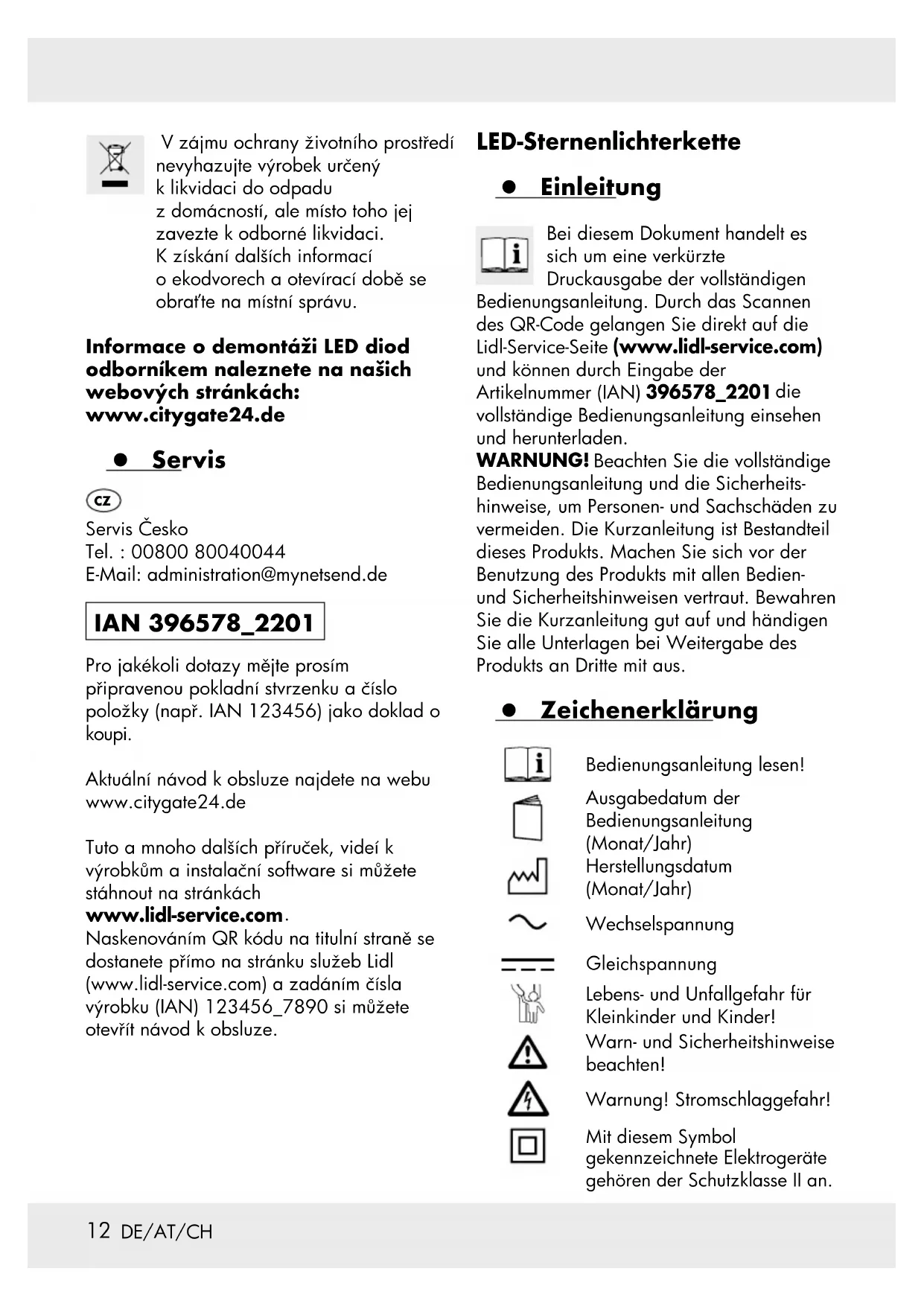Naskenováním QR kódu na titulní straně se dostanete přímo na stránku služeb Lidl (www.lidl-service.com) a zadáním čísla výrobku (IAN) 123456_7890 si můžete otevřít návod k obsluze. LED-Sternenlichterkette z Einleitung Bei diesem Dokument handelt es sich um eine verkürzte Druckausgabe der vollständigen Bedienungsanleitung. Durch das Scannen des QR-Code gelangen Sie direkt auf die Lidl-Service-Seite (www.lidl-service.com) und können durch Eingabe der Artikelnummer (IAN) 396578_2201 die vollständige Bedienungsanleitung einsehen und herunterladen. WARNUNG! Beachten Sie die vollständige Bedienungsanleitung und die Sicherheits- hinweise, um Personen- und Sachschäden zu vermeiden. Die Kurzanleitung ist Bestandteil dieses Produkts. Machen Sie sich vor der Benutzung des Produkts mit allen Bedien- und Sicherheitshinweisen vertraut. Bewahren Sie die Kurzanleitung gut auf und händigen Sie alle Unterlagen bei Weitergabe des Produkts an Dritte mit aus. z Zeichenerklärung Bedienungsanleitung lesen! Ausgabedatum der Bedienungsanleitung (Monat/Jahr) Herstellungsdatum (Monat/Jahr) Wechselspannung Gleichspannung Lebens- und Unfallgefahr für Kleinkinder und Kinder! Warn- und Sicherheitshinweise beachten! Warnung! Stromschlaggefahr! Mit diesem Symbol gekennzeichnete Elektrogeräte gehören der Schutzklasse II an.13 DE/AT/CH Geschützt gegen feste Fremdkörper mit Durchmesser ≥ 1,0 mm, spritzwassergeschützt Lichtfarbe Nicht zur Raumbeleuchtung geeignet. Für den Innen- und Außenbereich geeignet Netzbetrieb Kabellänge inkl. Stecker Steckernetzteil Das Symbol „GS“ steht für Geprüfte Sicherheit. Produkte, die mit diesem Zeichen gekennzeichnet sind, entsprechen den Anforderungen des deutschen Produktsicherheitsgesetzes (ProdSG). Entsorgen Sie Verpackung und Produkt umweltgerecht! Verpackung aus FSC- zertiziertem Mix-Holz Mit der CE-Kennzeichnung bestätigt der Hersteller, dass dieses Produkt den geltenden europäischen Richtlinien entspricht. Das Gerät enthält einen Sicherheitstransformator. Dieses Symbol bezeichnet ein unabhängiges Betriebsgerät, zur Verwendung außerhalb von Leuchten ohne zusätzliche Abdeckung. Dieses Symbol beschreibt die Polarität der Ausgangs- spannung an der Steckverbindung. SELV Der Begriff SELV (Safety Extra Low Voltage = Sicherheits- kleinspannung) bezeichnet Spannungen, die aufgrund ihrer geringen Spannungshöhe und Isolierung besonderen Schutz gegen elektrischen Schlag bieten. Separates Betriebsgerät durch Fachpersonal austauschbar. Die LED´s sind durch Fachpersonal austauschbar. z Bestimmungsgemäße Verwendung Das Produkt ist für die Dekoration im Innen- und Außenbereich geeignet. Dieses Produkt ist nur für den Einsatz in privaten Haushalten vorgesehen. Das Produkt ist kein Kinderspielzeug! Eine andere Verwendung als zuvor beschrieben oder eine Veränderung des Produktes ist nicht zulässig und kann zu Sachschäden oder sogar zu Personenschäden führen. Der Hersteller oder Händler übernimmt keine Haftung für Schäden, die durch nicht bestimmungsgemäßen oder falschen Gebrauch entstanden sind. z Lieferumfang 1119-R, 1119-W 1 x LED-Sternenlichterkette 1 x Netzstecker 1 x Bedienungsanleitung z Teilebeschreibung