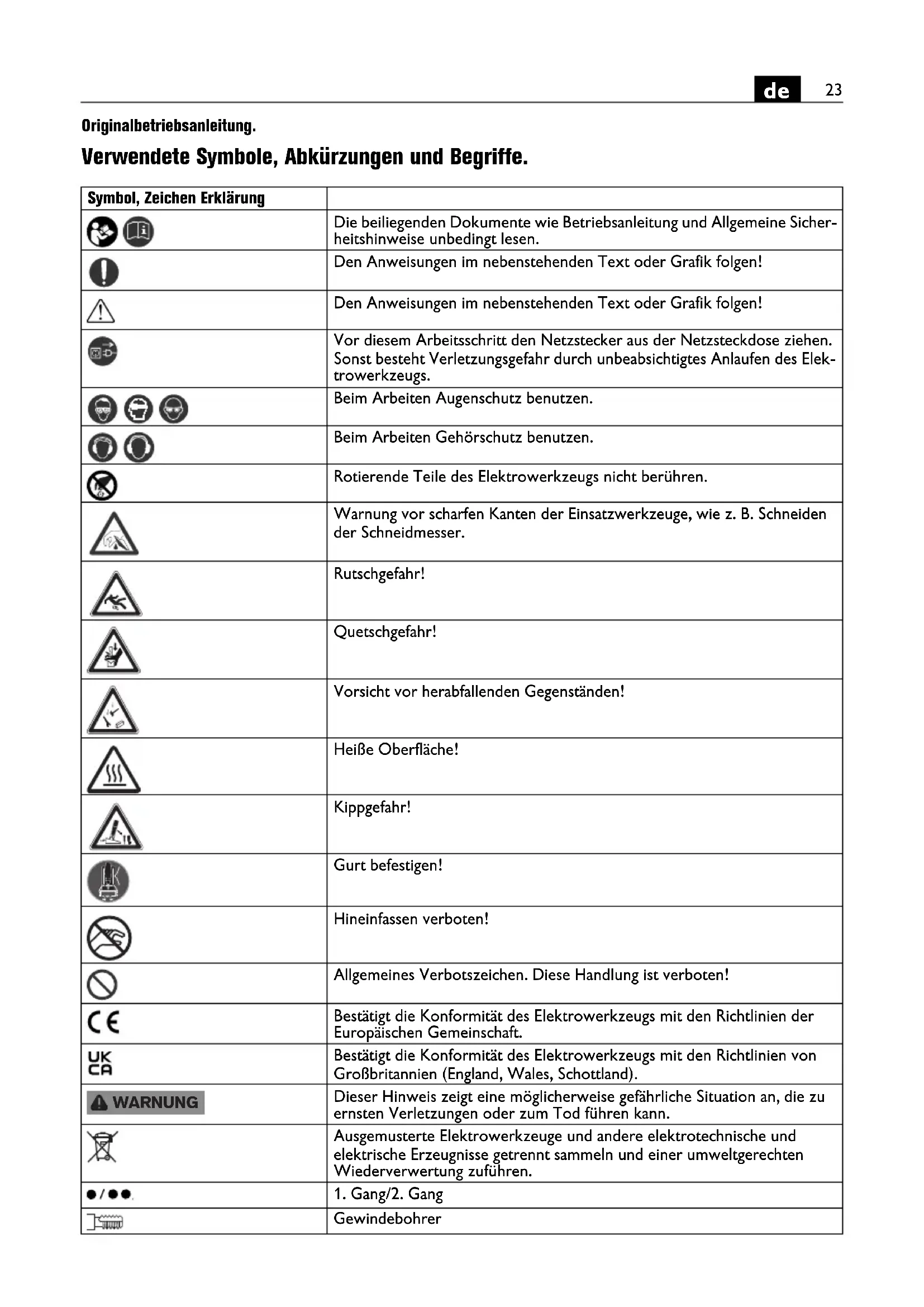 Originalbetriebsanleitung.Übersetzung der Originalbetriebsanleitung. Verwendete Symbole, Abkürzungen und Begriffe. Symbol, Zeichen Erklärung Die beiliegenden Dokumente wie Betriebsanleitung und Allgemeine Sicher- heitshinweise unbedingt lesen. Den Anweisungen im nebenstehenden Text oder Grafik folgen! Den Anweisungen im nebenstehenden Text oder Grafik folgen! Vor diesem Arbeitsschritt den Netzstecker aus der Netzsteckdose ziehen. Sonst besteht Verletzungsgefahr durch unbeabsichtigtes Anlaufen des Elek- trowerkzeugs. Beim Arbeiten Augenschutz benutzen. Beim Arbeiten Gehörschutz benutzen. Rotierende Teile des Elektrowerkzeugs nicht berühren. Warnung vor scharfen Kanten der Einsatzwerkzeuge, wie z. B. Schneiden der Schneidmesser. Rutschgefahr! Quetschgefahr! Vorsicht vor herabfallenden Gegenständen! Heiße Oberfläche! Kippgefahr! Gurt befestigen! Hineinfassen verboten! Allgemeines Verbotszeichen. Diese Handlung ist verboten! Bestätigt die Konformität des Elektrowerkzeugs mit den Richtlinien der Europäischen Gemeinschaft. Bestätigt die Konformität des Elektrowerkzeugs mit den Richtlinien von Großbritannien (England, Wales, Schottland). Dieser Hinweis zeigt eine möglicherweise gefährliche Situation an, die zu ernsten Verletzungen oder zum Tod führen kann. Ausgemusterte Elektrowerkzeuge und andere elektrotechnische und elektrische Erzeugnisse getrennt sammeln und einer umweltgerechten Wiederverwertung zuführen.