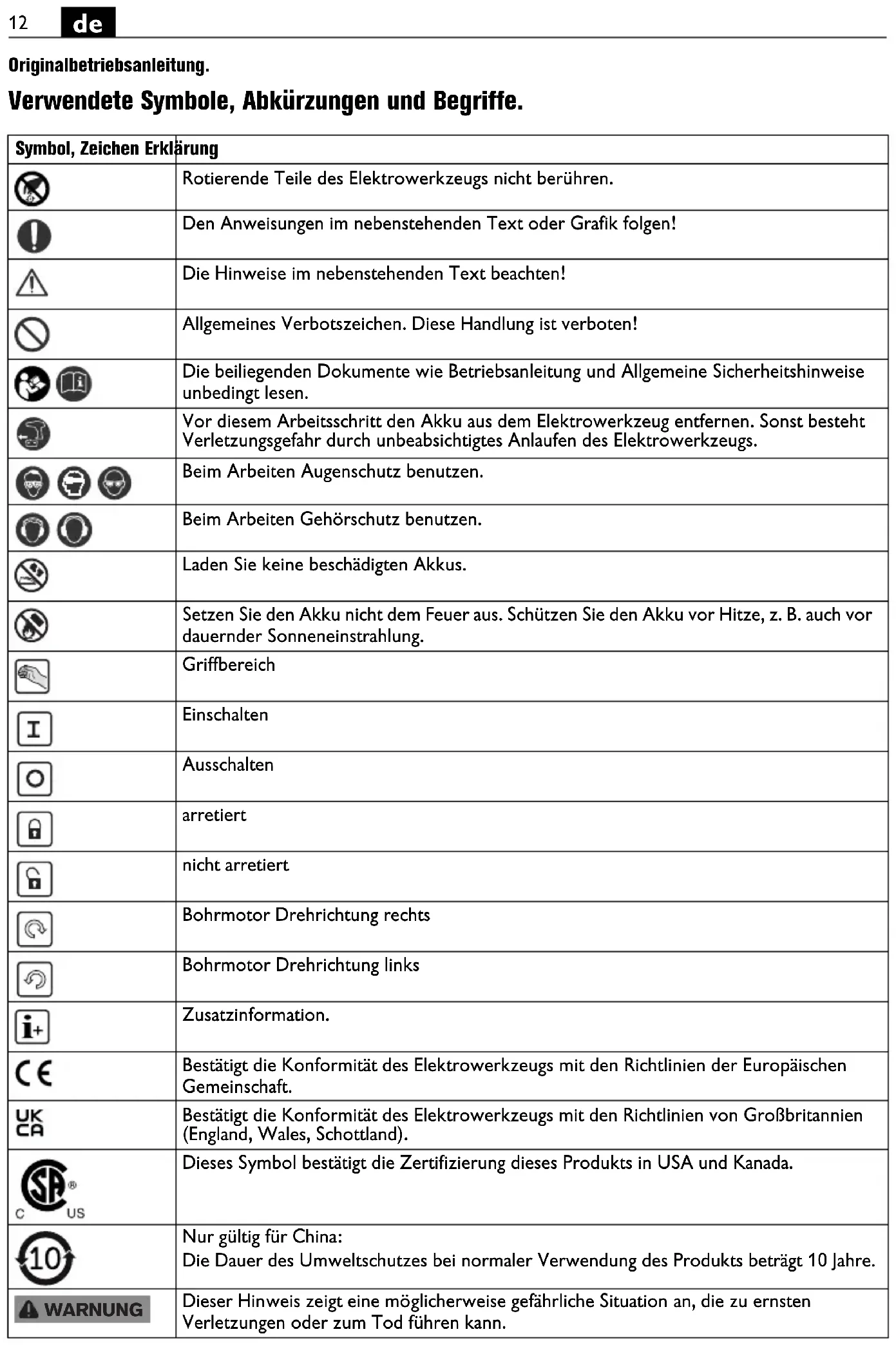 Originalbetriebsanleitung. Verwendete Symbole, Abkürzungen und Begriffe. Symbol, Zeichen Erklärung Rotierende Teile des Elektrowerkzeugs nicht berühren. Den Anweisungen im nebenstehenden Text oder Grafik folgen! Die Hinweise im nebenstehenden Text beachten! Allgemeines Verbotszeichen. Diese Handlung ist verboten! Die beiliegenden Dokumente wie Betriebsanleitung und Allgemeine Sicherheitshinweise unbedingt lesen. Vor diesem Arbeitsschritt den Akku aus dem Elektrowerkzeug entfernen. Sonst besteht Verletzungsgefahr durch unbeabsichtigtes Anlaufen des Elektrowerkzeugs. Beim Arbeiten Augenschutz benutzen. Beim Arbeiten Gehörschutz benutzen. Laden Sie keine beschädigten Akkus. Setzen Sie den Akku nicht dem Feuer aus. Schützen Sie den Akku vor Hitze, z. B. auch vor dauernder Sonneneinstrahlung. Griffbereich Einschalten Ausschalten arretiert nicht arretiert Bohrmotor Drehrichtung rechts Bohrmotor Drehrichtung links Zusatzinformation. Bestätigt die Konformität des Elektrowerkzeugs mit den Richtlinien der Europäischen Gemeinschaft. Bestätigt die Konformität des Elektrowerkzeugs mit den Richtlinien von Großbritannien (England, Wales, Schottland). Dieses Symbol bestätigt die Zertifizierung dieses Produkts in USA und Kanada. Nur gültig für China: Die Dauer des Umweltschutzes bei normaler Verwendung des Produkts beträgt 10 Jahre. Dieser Hinweis zeigt eine möglicherweise gefährliche Situation an, die zu ernsten Verletzungen oder zum Tod führen kann. WARNUNG13