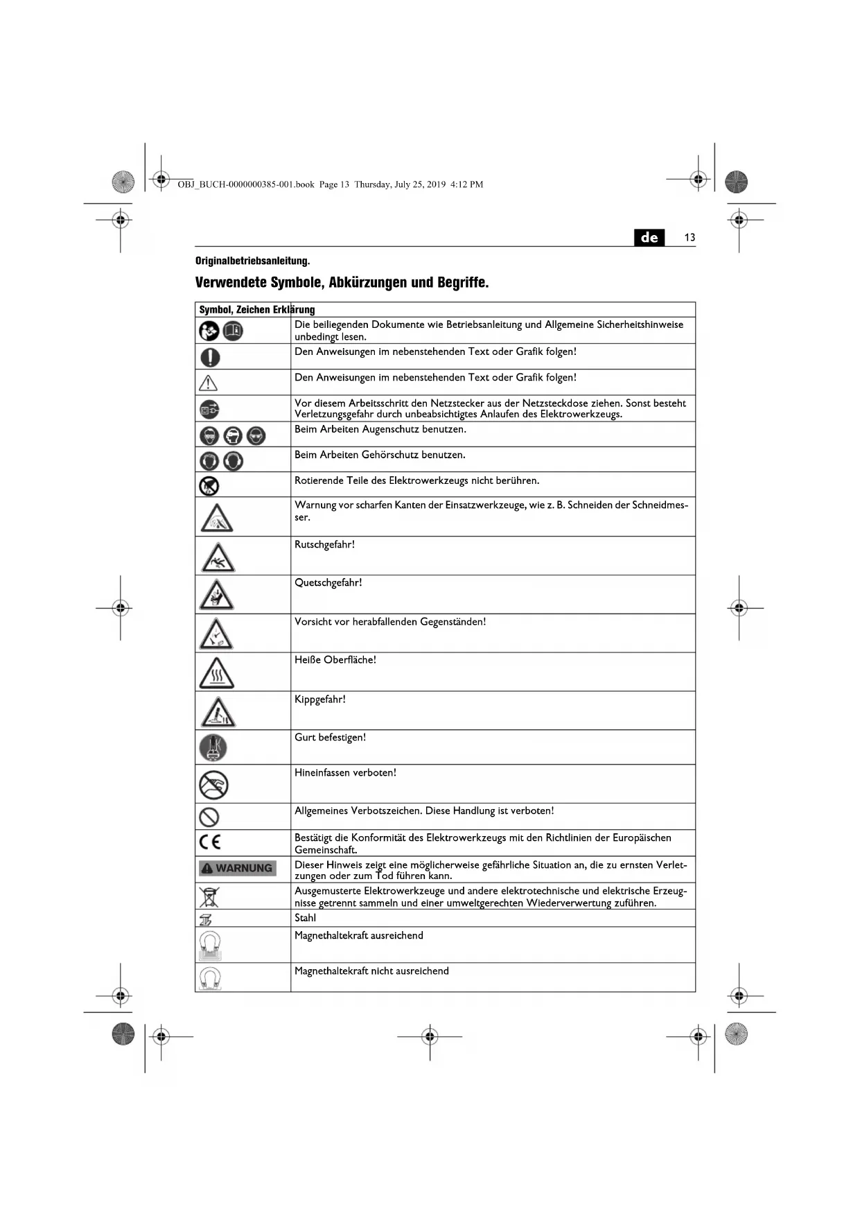 Originalbetriebsanleitung. Verwendete Symbole, Abkürzungen und Begriffe. Symbol, Zeichen Erklärung Die beiliegenden Dokumente wie Betriebsanleitung und Allgemeine Sicherheitshinweise unbedingt lesen. Den Anweisungen im nebenstehenden Text oder Grafik folgen! Den Anweisungen im nebenstehenden Text oder Grafik folgen! Vor diesem Arbeitsschritt den Netzstecker aus der Netzsteckdose ziehen. Sonst besteht Verletzungsgefahr durch unbeabsichtigtes Anlaufen des Elektrowerkzeugs. Beim Arbeiten Augenschutz benutzen. Beim Arbeiten Gehörschutz benutzen. Rotierende Teile des Elektrowerkzeugs nicht berühren. Warnung vor scharfen Kanten der Einsatzwerkzeuge, wie z. B. Schneiden der Schneidmes- ser. Rutschgefahr! Quetschgefahr! Vorsicht vor herabfallenden Gegenständen! Heiße Oberfläche! Kippgefahr! Gurt befestigen! Hineinfassen verboten! Allgemeines Verbotszeichen. Diese Handlung ist verboten! Bestätigt die Konformität des Elektrowerkzeugs mit den Richtlinien der Europäischen Gemeinschaft. Dieser Hinweis zeigt eine möglicherweise gefährliche Situation an, die zu ernsten Verlet- zungen oder zum Tod führen kann. Ausgemusterte Elektrowerkzeuge und andere elektrotechnische und elektrische Erzeug- nisse getrennt sammeln und einer umweltgerechten Wiederverwertung zuführen. Stahl Magnethaltekraft ausreichend Magnethaltekraft nicht ausreichend WARNUNG OBJ_BUCH-0000000385-001.book Page 13 Thursday, July 25, 2019 4:12 PM14