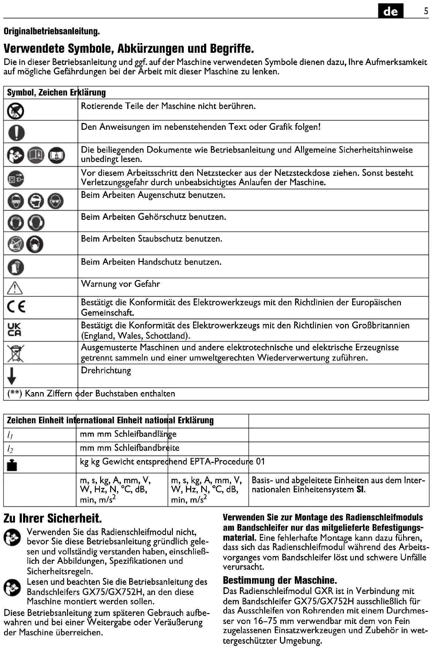 Das Radienschleifmodul GXR ist in Verbindung mit dem Bandschleifer GX75/GX752H ausschließlich für das Ausschleifen von Rohrenden mit einem Durchmesser von 16-75 mm verwendbar mit dem von Fein zugelassenen Einsatzwerkzeugen und Zubehör in wettergeschützter Umgebung.