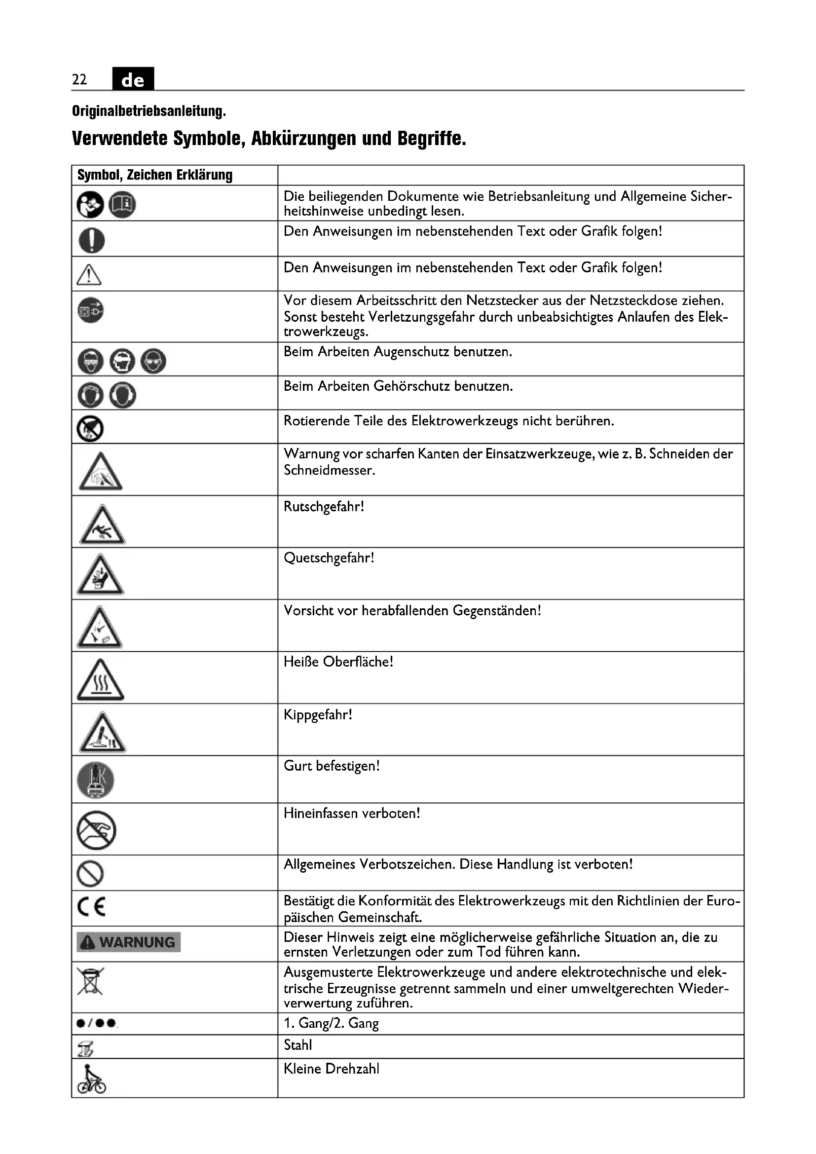 Originalbetriebsanleitung. Verwendete Symbole, Abkürzungen und Begriffe. Symbol, Zeichen Erklärung Die beiliegenden Dokumente wie Betriebsanleitung und Allgemeine Sicher- heitshinweise unbedingt lesen. Den Anweisungen im nebenstehenden Text oder Grafik folgen! Den Anweisungen im nebenstehenden Text oder Grafik folgen! Vor diesem Arbeitsschritt den Netzstecker aus der Netzsteckdose ziehen. Sonst besteht Verletzungsgefahr durch unbeabsichtigtes Anlaufen des Elek- trowerkzeugs. Beim Arbeiten Augenschutz benutzen. Beim Arbeiten Gehörschutz benutzen. Rotierende Teile des Elektrowerkzeugs nicht berühren. Warnung vor scharfen Kanten der Einsatzwerkzeuge, wie z. B. Schneiden der Schneidmesser. Rutschgefahr! Quetschgefahr! Vorsicht vor herabfallenden Gegenständen! Heiße Oberfläche! Kippgefahr! Gurt befestigen! Hineinfassen verboten! Allgemeines Verbotszeichen. Diese Handlung ist verboten! Bestätigt die Konformität des Elektrowerkzeugs mit den Richtlinien der Euro- päischen Gemeinschaft. Dieser Hinweis zeigt eine möglicherweise gefährliche Situation an, die zu ernsten Verletzungen oder zum Tod führen kann. Ausgemusterte Elektrowerkzeuge und andere elektrotechnische und elek- trische Erzeugnisse getrennt sammeln und einer umweltgerechten Wieder- verwertung zuführen.