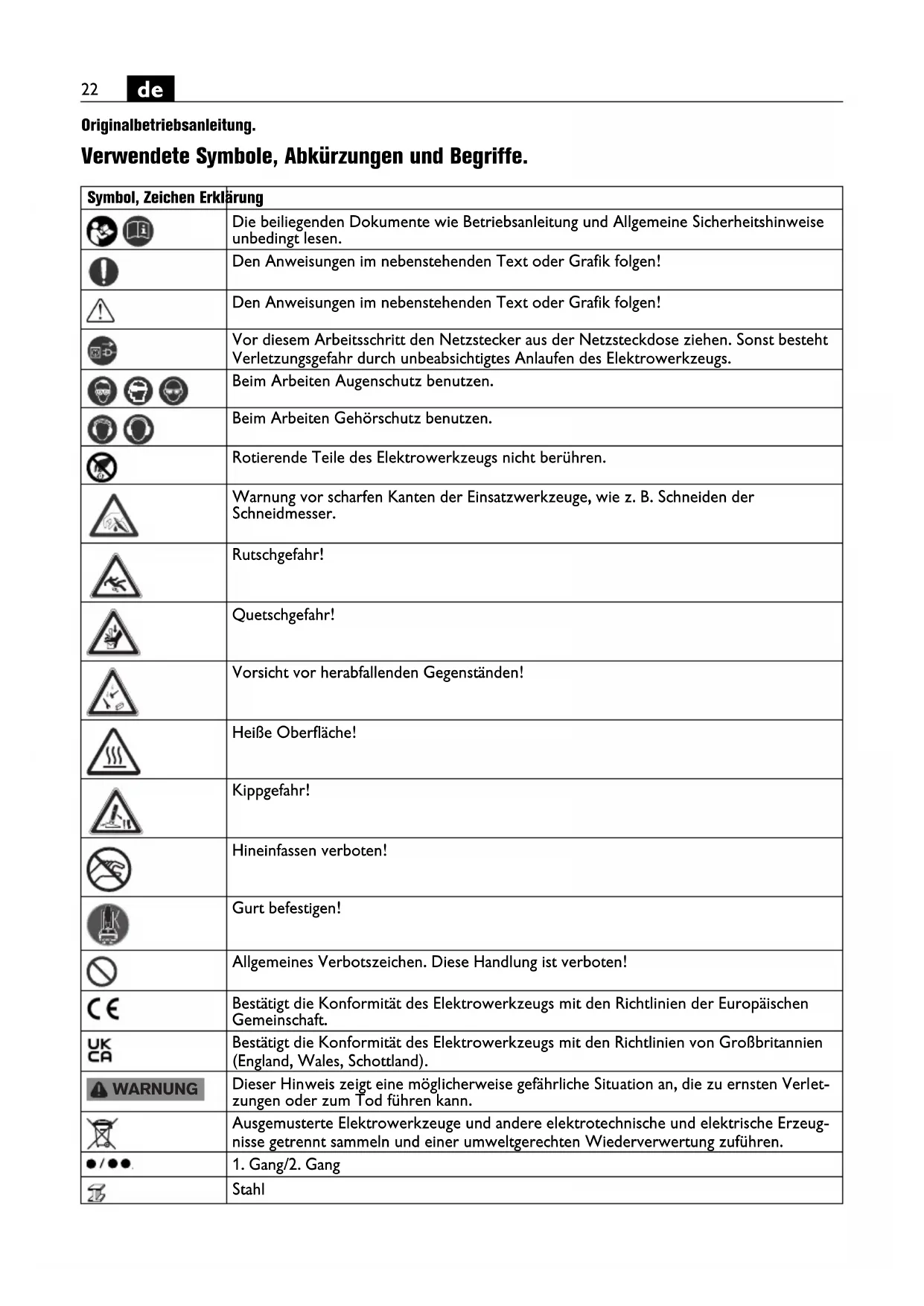 Originalbetriebsanleitung.Übersetzung der Originalbetriebsanleitung. Verwendete Symbole, Abkürzungen und Begriffe. Symbol, Zeichen Erklärung Die beiliegenden Dokumente wie Betriebsanleitung und Allgemeine Sicherheitshinweise unbedingt lesen. Den Anweisungen im nebenstehenden Text oder Grafik folgen! Den Anweisungen im nebenstehenden Text oder Grafik folgen! Vor diesem Arbeitsschritt den Netzstecker aus der Netzsteckdose ziehen. Sonst besteht Verletzungsgefahr durch unbeabsichtigtes Anlaufen des Elektrowerkzeugs. Beim Arbeiten Augenschutz benutzen. Beim Arbeiten Gehörschutz benutzen. Rotierende Teile des Elektrowerkzeugs nicht berühren. Warnung vor scharfen Kanten der Einsatzwerkzeuge, wie z. B. Schneiden der Schneidmesser. Rutschgefahr! Quetschgefahr! Vorsicht vor herabfallenden Gegenständen! Heiße Oberfläche! Kippgefahr! Hineinfassen verboten! Gurt befestigen! Allgemeines Verbotszeichen. Diese Handlung ist verboten! Bestätigt die Konformität des Elektrowerkzeugs mit den Richtlinien der Europäischen Gemeinschaft. Bestätigt die Konformität des Elektrowerkzeugs mit den Richtlinien von Großbritannien (England, Wales, Schottland). Dieser Hinweis zeigt eine möglicherweise gefährliche Situation an, die zu ernsten Verlet- zungen oder zum Tod führen kann. Ausgemusterte Elektrowerkzeuge und andere elektrotechnische und elektrische Erzeug- nisse getrennt sammeln und einer umweltgerechten Wiederverwertung zuführen.