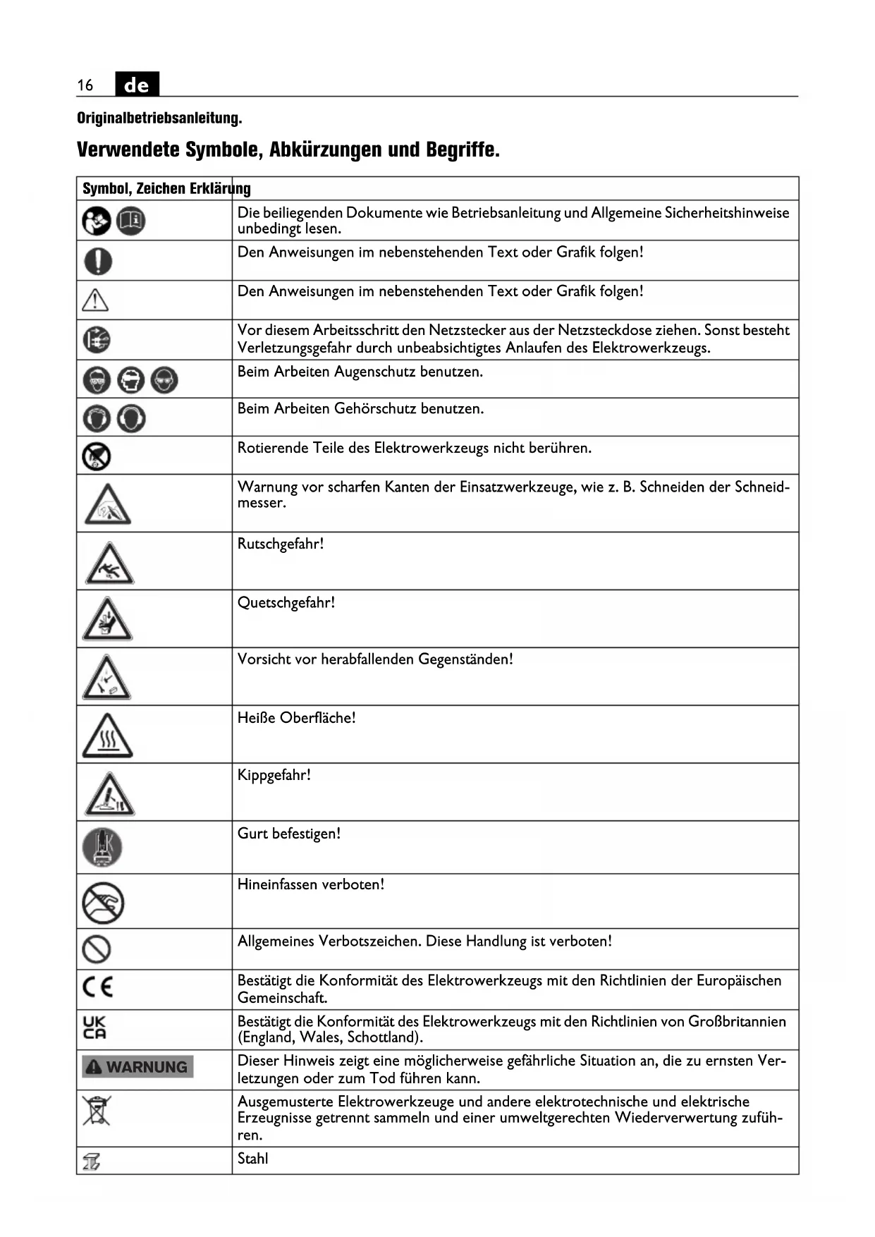 Originalbetriebsanleitung.Übersetzung der Originalbetriebsanleitung. Verwendete Symbole, Abkürzungen und Begriffe. Symbol, Zeichen Erklärung Die beiliegenden Dokumente wie Betriebsanleitung und Allgemeine Sicherheitshinweise unbedingt lesen. Den Anweisungen im nebenstehenden Text oder Grafik folgen! Den Anweisungen im nebenstehenden Text oder Grafik folgen! Vor diesem Arbeitsschritt den Netzstecker aus der Netzsteckdose ziehen. Sonst besteht Verletzungsgefahr durch unbeabsichtigtes Anlaufen des Elektrowerkzeugs. Beim Arbeiten Augenschutz benutzen. Beim Arbeiten Gehörschutz benutzen. Rotierende Teile des Elektrowerkzeugs nicht berühren. Warnung vor scharfen Kanten der Einsatzwerkzeuge, wie z. B. Schneiden der Schneid- messer. Rutschgefahr! Quetschgefahr! Vorsicht vor herabfallenden Gegenständen! Heiße Oberfläche! Kippgefahr! Gurt befestigen! Hineinfassen verboten! Allgemeines Verbotszeichen. Diese Handlung ist verboten! Bestätigt die Konformität des Elektrowerkzeugs mit den Richtlinien der Europäischen Gemeinschaft. Bestätigt die Konformität des Elektrowerkzeugs mit den Richtlinien von Großbritannien (England, Wales, Schottland). Dieser Hinweis zeigt eine möglicherweise gefährliche Situation an, die zu ernsten Ver- letzungen oder zum Tod führen kann. Ausgemusterte Elektrowerkzeuge und andere elektrotechnische und elektrische Erzeugnisse getrennt sammeln und einer umweltgerechten Wiederverwertung zufüh- ren. Stahl WARNUNG17