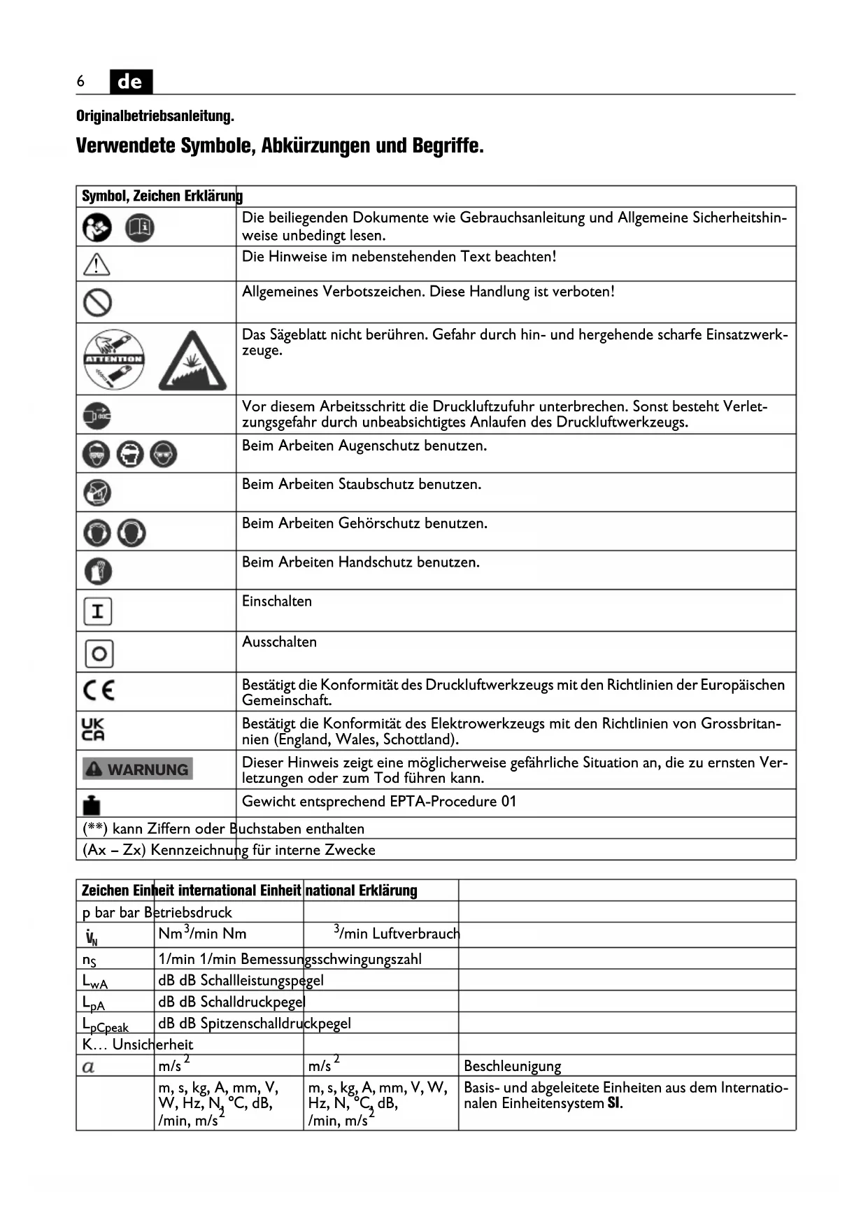 Originalbetriebsanleitung. Verwendete Symbole, Abkürzungen und Begriffe. Symbol, Zeichen Erklärung Die beiliegenden Dokumente wie Gebrauchsanleitung und Allgemeine Sicherheitshin- weise unbedingt lesen. Die Hinweise im nebenstehenden Text beachten! Allgemeines Verbotszeichen. Diese Handlung ist verboten! Das Sägeblatt nicht berühren. Gefahr durch hin- und hergehende scharfe Einsatzwerk- zeuge. Vor diesem Arbeitsschritt die Druckluftzufuhr unterbrechen. Sonst besteht Verlet- zungsgefahr durch unbeabsichtigtes Anlaufen des Druckluftwerkzeugs. Beim Arbeiten Augenschutz benutzen. Beim Arbeiten Staubschutz benutzen. Beim Arbeiten Gehörschutz benutzen. Beim Arbeiten Handschutz benutzen. Einschalten Ausschalten Bestätigt die Konformität des Druckluftwerkzeugs mit den Richtlinien der Europäischen Gemeinschaft. Bestätigt die Konformität des Elektrowerkzeugs mit den Richtlinien von Grossbritan- nien (England, Wales, Schottland). Dieser Hinweis zeigt eine möglicherweise gefährliche Situation an, die zu ernsten Ver- letzungen oder zum Tod führen kann. Gewicht entsprechend EPTA-Procedure 01 (**) kann Ziffern oder Buchstaben enthalten (Ax – Zx) Kennzeichnung für interne Zwecke Zeichen Einheit international Einheit national Erklärung p bar bar Betriebsdruck