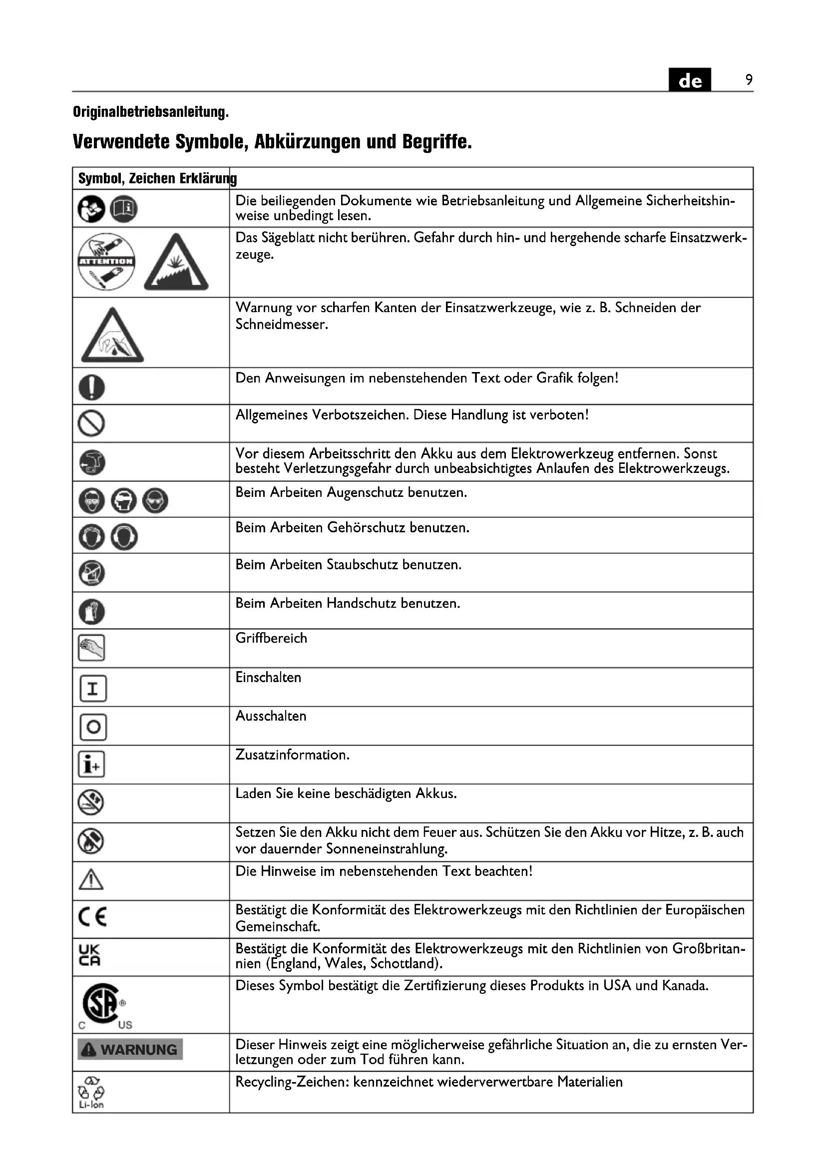 Originalbetriebsanleitung.Übersetzung der Originalbetriebsanleitung. Verwendete Symbole, Abkürzungen und Begriffe. Symbol, Zeichen Erklärung Die beiliegenden Dokumente wie Betriebsanleitung und Allgemeine Sicherheitshin- weise unbedingt lesen. Das Sägeblatt nicht berühren. Gefahr durch hin- und hergehende scharfe Einsatzwerk- zeuge. Warnung vor scharfen Kanten der Einsatzwerkzeuge, wie z. B. Schneiden der Schneidmesser. Den Anweisungen im nebenstehenden Text oder Grafik folgen! Allgemeines Verbotszeichen. Diese Handlung ist verboten! Vor diesem Arbeitsschritt den Akku aus dem Elektrowerkzeug entfernen. Sonst besteht Verletzungsgefahr durch unbeabsichtigtes Anlaufen des Elektrowerkzeugs. Beim Arbeiten Augenschutz benutzen. Beim Arbeiten Gehörschutz benutzen. Beim Arbeiten Staubschutz benutzen. Beim Arbeiten Handschutz benutzen. Griffbereich Einschalten Ausschalten Zusatzinformation. Laden Sie keine beschädigten Akkus. Setzen Sie den Akku nicht dem Feuer aus. Schützen Sie den Akku vor Hitze, z. B. auch vor dauernder Sonneneinstrahlung. Die Hinweise im nebenstehenden Text beachten! Bestätigt die Konformität des Elektrowerkzeugs mit den Richtlinien der Europäischen Gemeinschaft. Bestätigt die Konformität des Elektrowerkzeugs mit den Richtlinien von Großbritan- nien (England, Wales, Schottland). Dieses Symbol bestätigt die Zertifizierung dieses Produkts in USA und Kanada. Dieser Hinweis zeigt eine möglicherweise gefährliche Situation an, die zu ernsten Ver- letzungen oder zum Tod führen kann. Recycling-Zeichen: kennzeichnet wiederverwertbare Materialien WARNUNG10