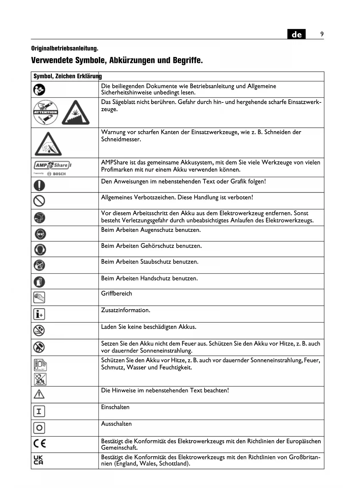 | Das Sägeblatt nicht berühren. Gefahr durch hin- und hergehende scharfe Einsatzwerk-zeuge. | |