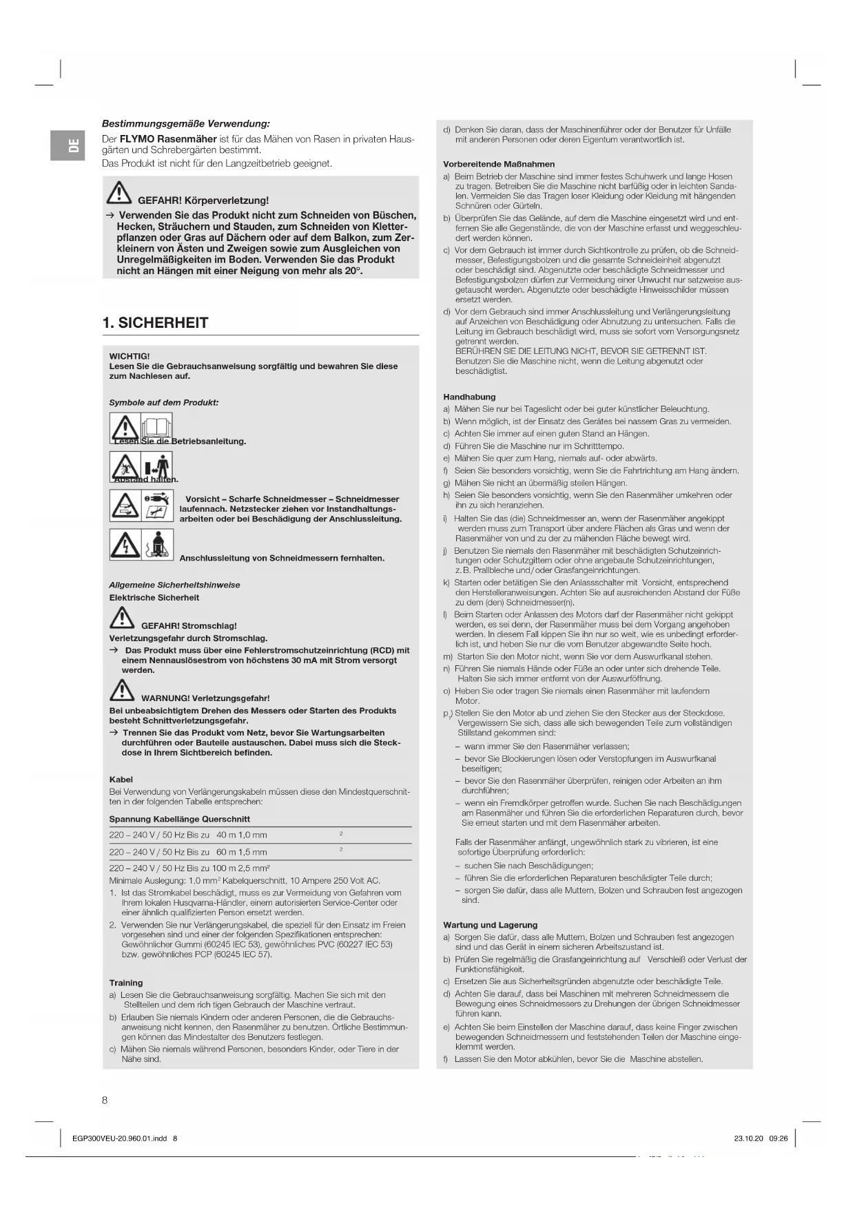 EGP300VEU-20.960.01.indd 7 23.10.20 09:26WICHTIG! Lesen Sie die Gebrauchsanweisung sorgfältig und bewahren Sie diese zum Nachlesen auf. Symbole auf dem Produkt: Lesen Sie die Betriebsanleitung. Abstand halten. Vorsicht – Scharfe Schneidmesser – Schneidmesser laufen nach. Netzstecker ziehen vor Instandhaltungs- arbeiten oder bei Beschädigung der Anschlussleitung.