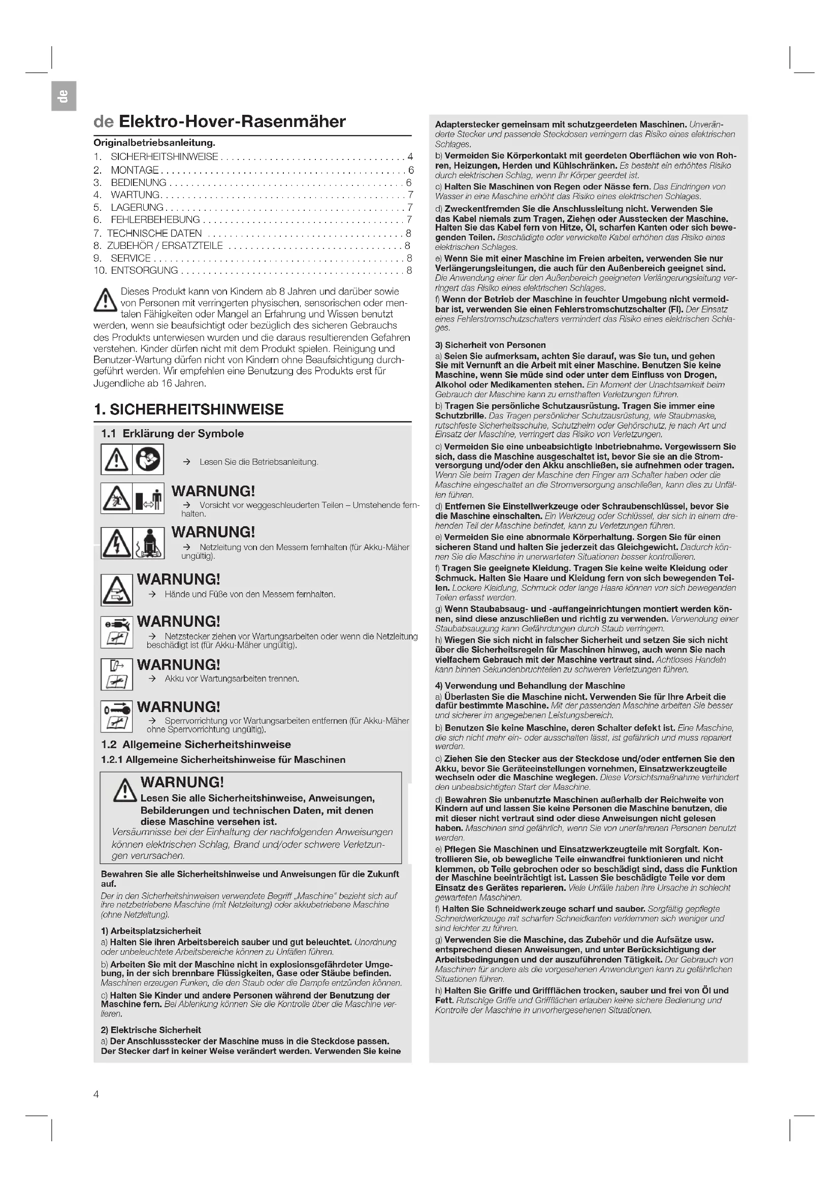 1.2.2 Sicherheitshinweise für Rasenmaher