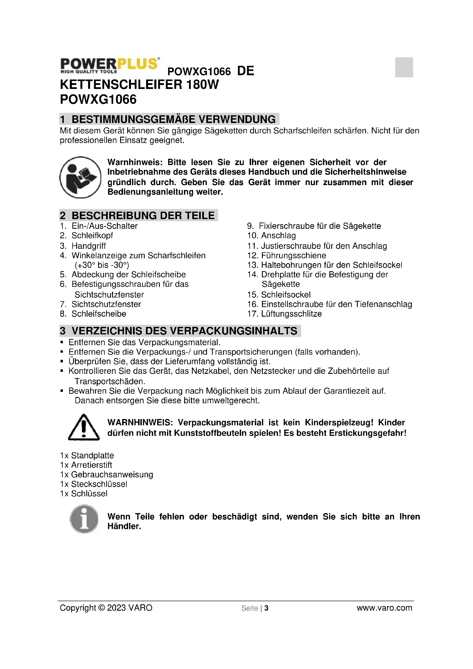 Copyright © 2023 VARO Seite | 3 www.varo.com KETTENSCHLEIFER 180W POWXG1066 1 BESTIMMUNGSGEMÄßE VERWENDUNG Mit diesem Gerät können Sie gängige Sägeketten durch Scharfschleifen schärfen. Nicht für den professionellen Einsatz geeignet. Warnhinweis: Bitte lesen Sie zu Ihrer eigenen Sicherheit vor der Inbetriebnahme des Geräts dieses Handbuch und die Sicherheitshinweise gründlich durch. Geben Sie das Gerät immer nur zusammen mit dieser Bedienungsanleitung weiter.