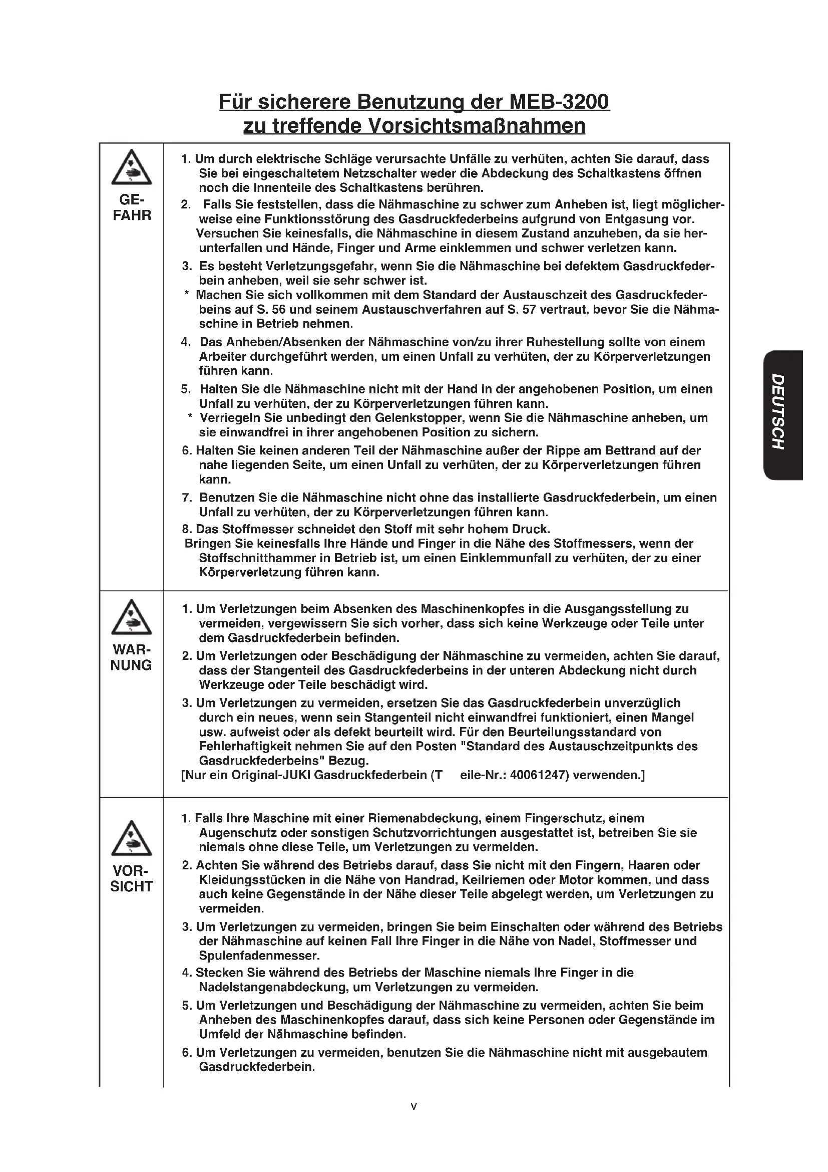 Um Verletzungen zu vermeiden, benutzen Sie die Nähmaschine nicht mit ausgebautem Gasdruckfederbein. Für sicherere Benutzung der MEB-3200 zu treffende Vorsichtsmaßnahmen DEUTSCH GE- FAHR VOR- SICHT WAR- NUNGvi