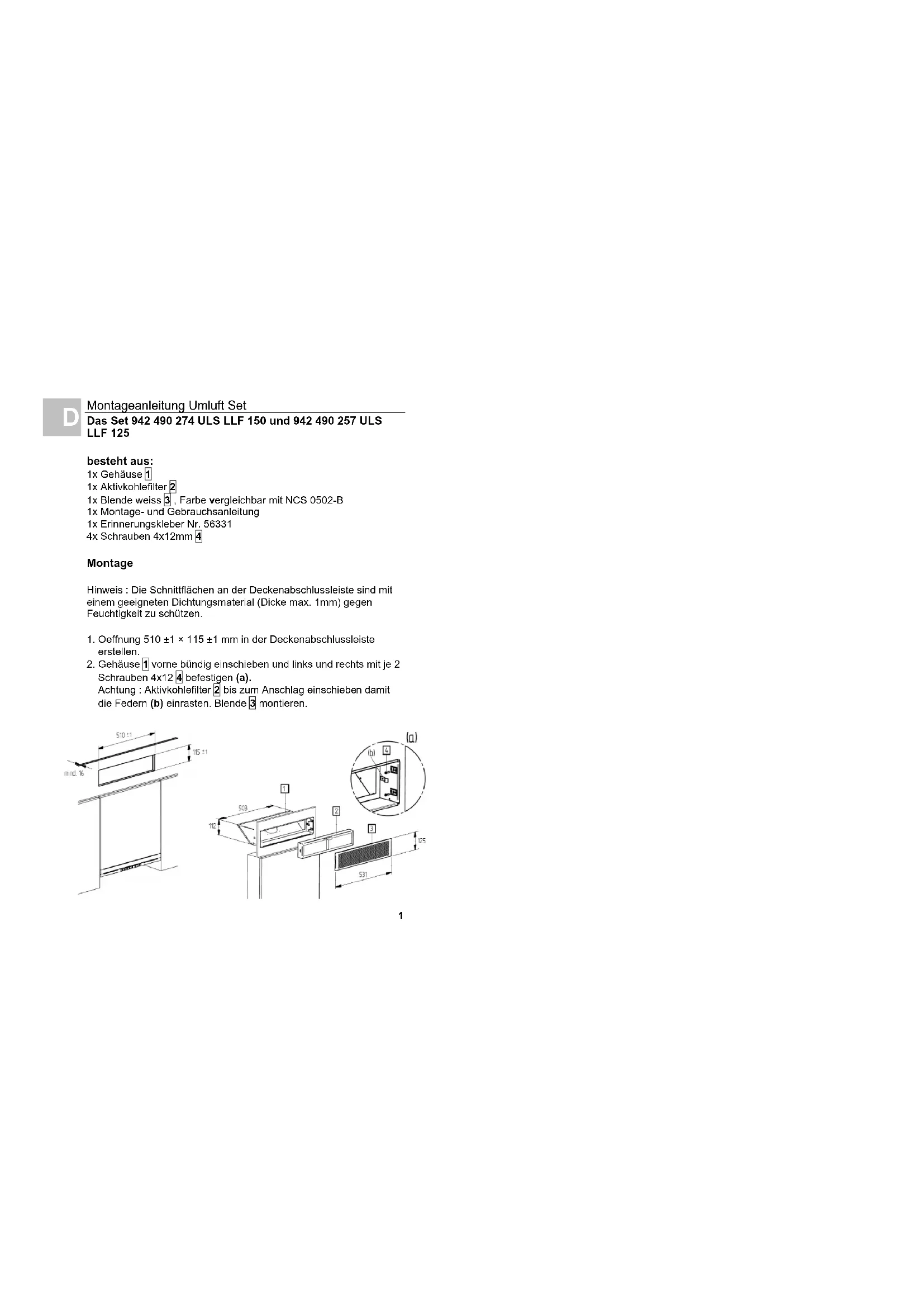 56407 01.12 ULS LLF 150/ 1251 Montageanleitung Umluft Set Das Set 942 490 274 ULS LLF 150 und 942 490 257 ULS LLF 125 besteht aus: 1x Gehäuse 1 1x Aktivkohlefilter 2 1x Blende weiss 3 , Farbe vergleichbar mit NCS 0502-B 1x Montage- und Gebrauchsanleitung 1x Erinnerungskleber Nr. 56331 4x Schrauben 4x12mm 4 Montage Hinweis : Die Schnittflächen an der Deckenabschlussleiste sind mit einem geeigneten Dichtungsmaterial (Dicke max. 1mm) gegen Feuchtigkeit zu schützen.