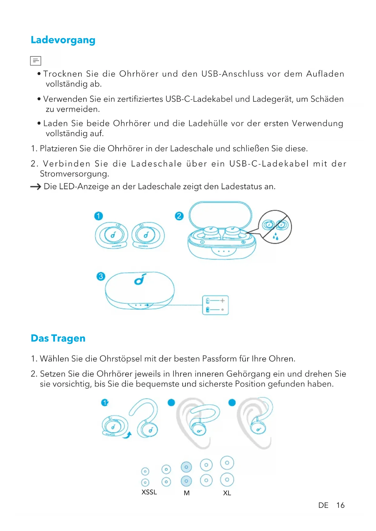 - Laden Sie beide Ohrhörer und die Ladehülle vor der ersten Verwendung vollständig auf.