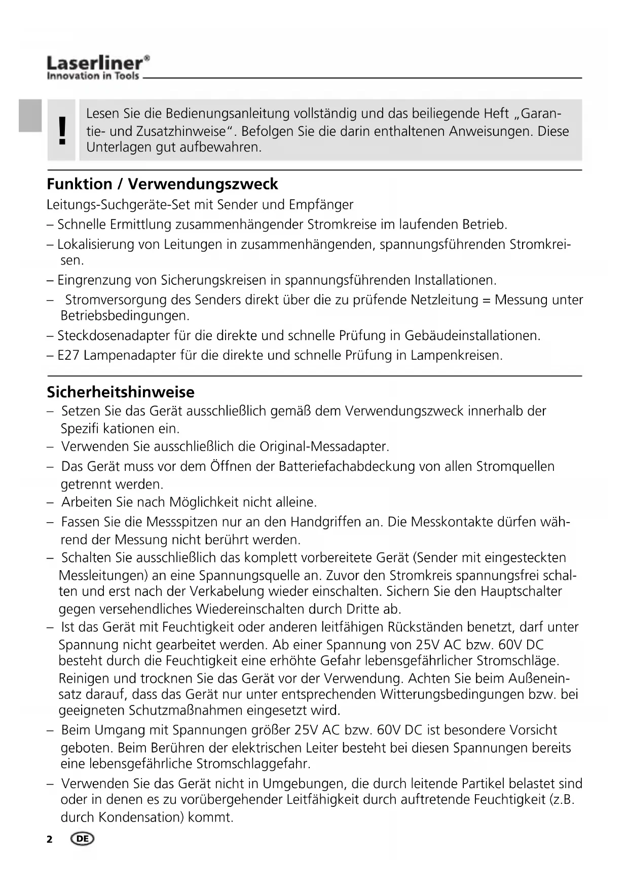 Leitungs-Suchgeräte-Set mit Sender und Empfänger – Schnelle Ermittlung zusammenhängender Stromkreise im laufenden Betrieb. – Lokalisierung von Leitungen in zusammenhängenden, spannungsführenden Stromkrei- sen. – Eingrenzung von Sicherungskreisen in spannungsführenden Installationen. – Stromversorgung des Senders direkt über die zu prüfende Netzleitung = Messung unter Betriebsbedingungen. – Steckdosenadapter für die direkte und schnelle Prüfung in Gebäudeinstallationen. – E27 Lampenadapter für die direkte und schnelle Prüfung in Lampenkreisen. Funktion / Verwendungszweck – Setzen Sie das Gerät ausschließlich gemäß dem Verwendungszweck innerhalb der SpeziÖ kationen ein. – Verwenden Sie ausschließlich die Original-Messadapter. – Das Gerät muss vor dem Öffnen der Batteriefachabdeckung von allen Stromquellen getrennt werden. – Arbeiten Sie nach Möglichkeit nicht alleine. – Fassen Sie die Messspitzen nur an den Handgriffen an. Die Messkontakte dürfen wäh- rend der Messung nicht berührt werden. – Schalten Sie ausschließlich das komplett vorbereitete Gerät (Sender mit eingesteckten Messleitungen) an eine Spannungsquelle an. Zuvor den Stromkreis spannungsfrei schal- ten und erst nach der Verkabelung wieder einschalten. Sichern Sie den Hauptschalter gegen versehendliches Wiedereinschalten durch Dritte ab. – Ist das Gerät mit Feuchtigkeit oder anderen leitfähigen Rückständen benetzt, darf unter Spannung nicht gearbeitet werden. Ab einer Spannung von 25V AC bzw. 60V DC besteht durch die Feuchtigkeit eine erhöhte Gefahr lebensgefährlicher Stromschläge. Reinigen und trocknen Sie das Gerät vor der Verwendung. Achten Sie beim Außenein- satz darauf, dass das Gerät nur unter entsprechenden Witterungsbedingungen bzw. bei geeigneten Schutzmaßnahmen eingesetzt wird. – Beim Umgang mit Spannungen größer 25V AC bzw. 60V DC ist besondere Vorsicht geboten. Beim Berühren der elektrischen Leiter besteht bei diesen Spannungen bereits eine lebensgefährliche Stromschlaggefahr. – Verwenden Sie das Gerät nicht in Umgebungen, die durch leitende Partikel belastet sind oder in denen es zu vorübergehender Leitfähigkeit durch auftretende Feuchtigkeit (z.B. durch Kondensation) kommt. Sicherheitshinweise Lesen Sie die Bedienungsanleitung vollständig und das beiliegende Heft „Garan- tie- und Zusatzhinweise“. Befolgen Sie die darin enthaltenen Anweisungen. Diese Unterlagen gut aufbewahren.