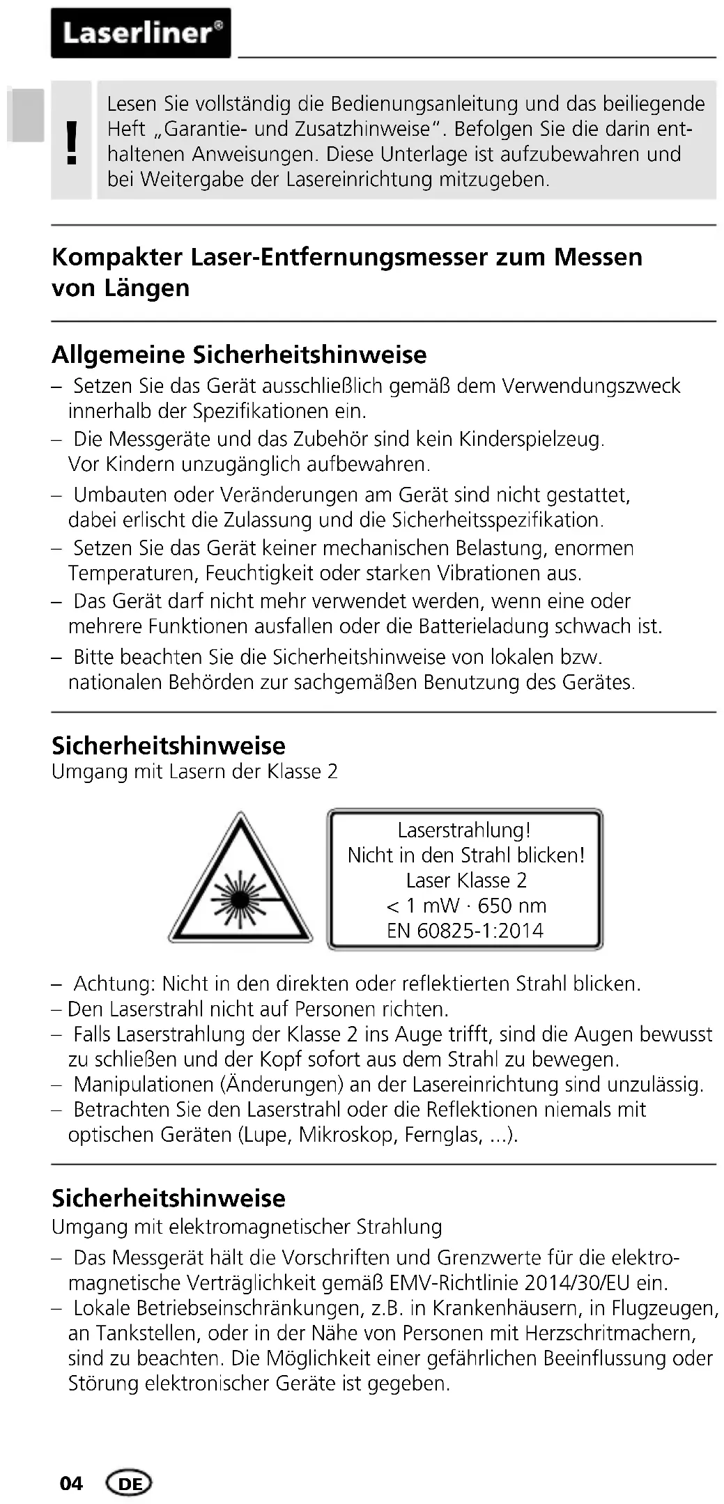 Lesen Sie vollständig die Bedienungsanleitung und das beiliegende Heft „Garantie- und Zusatzhinweise“. Befolgen Sie die darin ent- haltenen Anweisungen. Diese Unterlage ist aufzubewahren und bei Weitergabe der Lasereinrichtung mitzugeben.