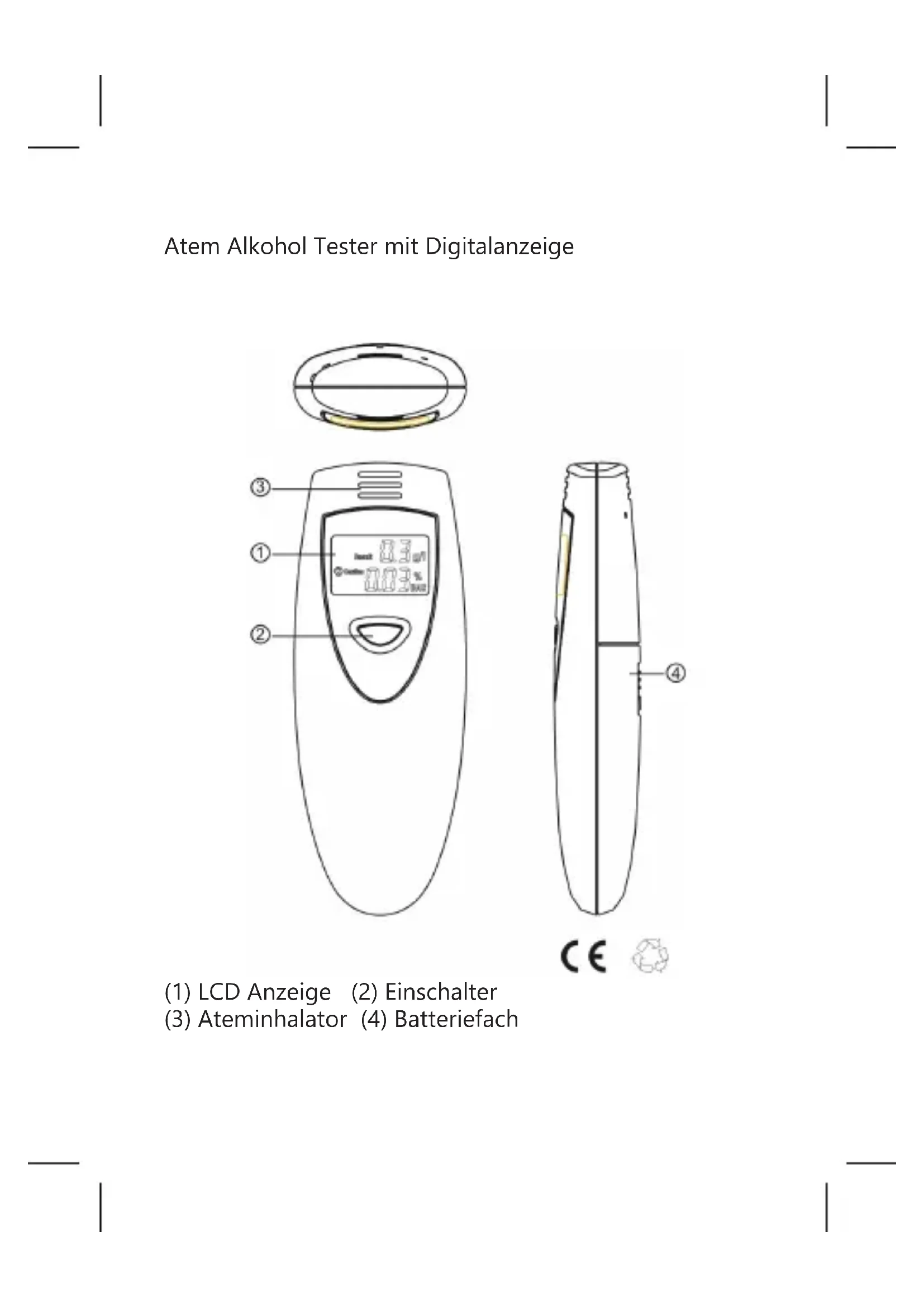Mobiset GmbH - Rösrather Straße 333 - 51107 Köln Tel: +49 22 19 89 52 0 - Fax: +49 22 19 89 52 39 Dieses Produkt ist konform mit allen relevanten Richtlinien des europäischen Parlamentes. Die vollständige CE-Erklärung mit allen angewandten Teststandards erhalten Sie als download auf unserer Homepage www.s2g.info This product is in accordance with all relevant regulations of the European parlament. The full CE-declaration with all applied test standards can be found as download on our homepage www.s2g.infoAlkoholtester Digital breathalyzer Digitale Alcohol Ademtester Ethylotest Numérique Mobiset GmbH - Rösrather Straße 333 - 51107 Köln Tel: +49 22 19 89 52 0 - Fax: +49 22 19 89 52 39Atem Alkohol Tester mit Digitalanzeige (1) LCD Anzeige (2) Einschalter (3) Ateminhalator (4) BatteriefachMerkmale