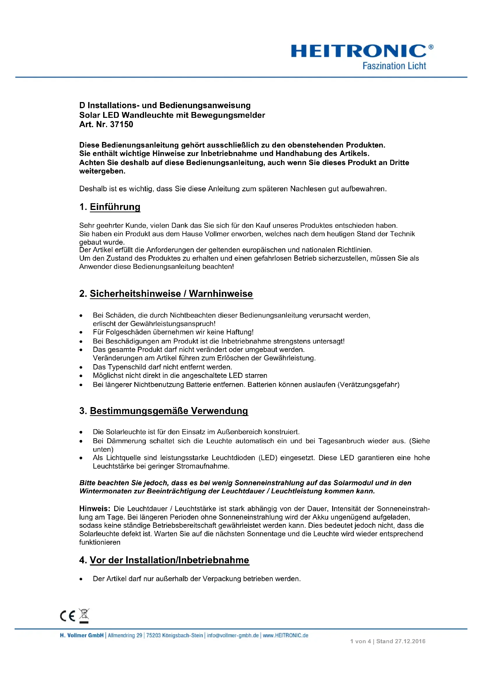 1 von 4 | Stand 27.12.2016 D Installations- und Bedienungsanweisung Solar LED Wandleuchte mit Bewegungsmelder Art. Nr. 37150 Diese Bedienungsanleitung gehört ausschließlich zu den obenstehenden Produkten. Sie enthält wichtige Hinweise zur Inbetriebnahme und Handhabung des Artikels. Achten Sie deshalb auf diese Bedienungsanleitung, auch wenn Sie dieses Produkt an Dritte weitergeben. Deshalb ist es wichtig, dass Sie diese Anleitung zum späteren Nachlesen gut aufbewahren.