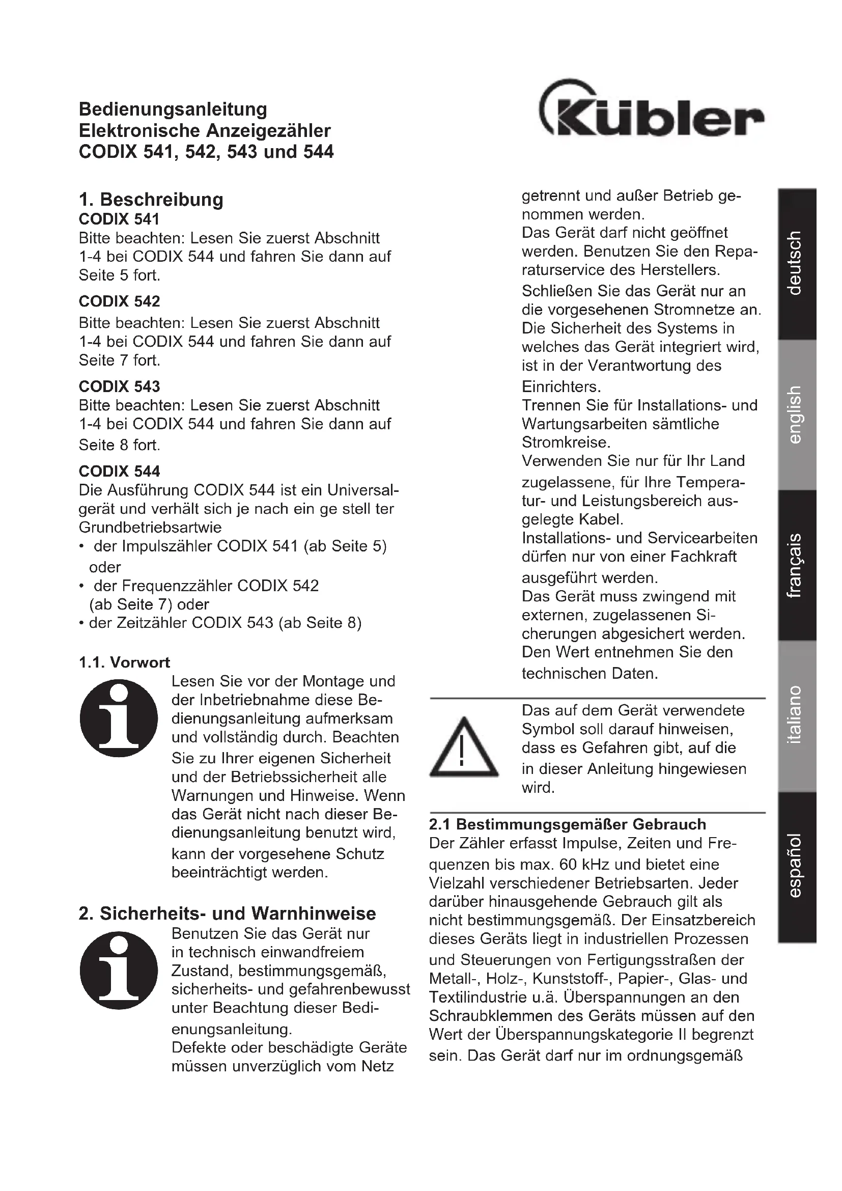 Der Zähler erfasst Impulse, Zeiten und Fre- quenzen bis max. 60 kHz und bietet eine Vielzahl verschiedener Betriebsarten. Jeder darüber hinausgehende Gebrauch gilt als nicht bestimmungsgemäß. Der Einsatzbereich dieses Geräts liegt in industriellen Prozessen und Steuerungen von Fertigungsstraßen der Metall-, Holz-, Kunststoff-, Papier-, Glas- und Textilindustrie u.ä. Überspannungen an den Schraubklemmen des Geräts müssen auf den Wert der Überspannungskategorie II begrenzt sein. Das Gerät darf nur im ordnungsgemäß deutsch english français italiano español Bedienungsanleitung Elektronische Anzeigezähler CODIX 541, 542, 543 und 544
