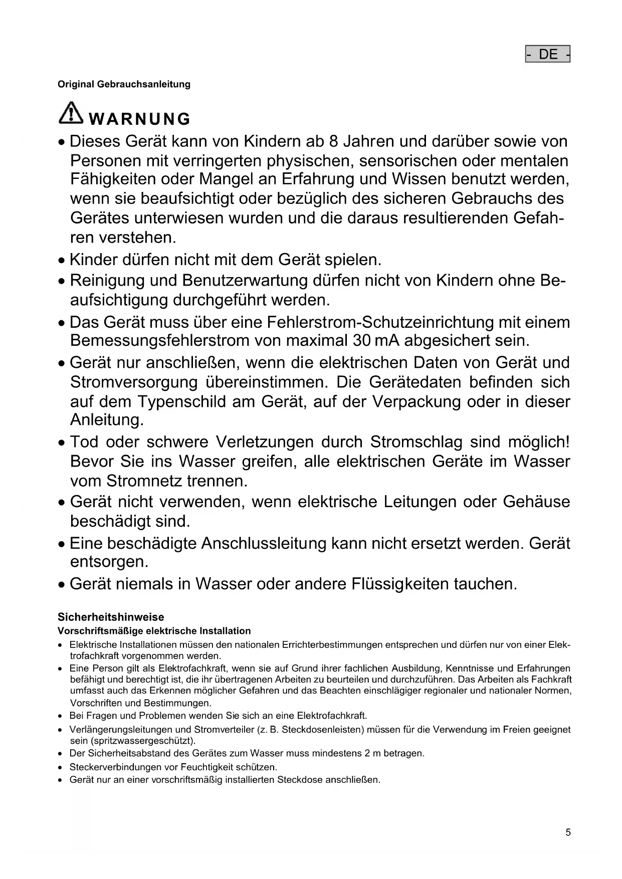 - Das Gerät muss über eine Fehlerstrom-Schutzeinrichtung mit einem Bemessungsfehlerstrom von maximal 30 mA abgesichert sein.