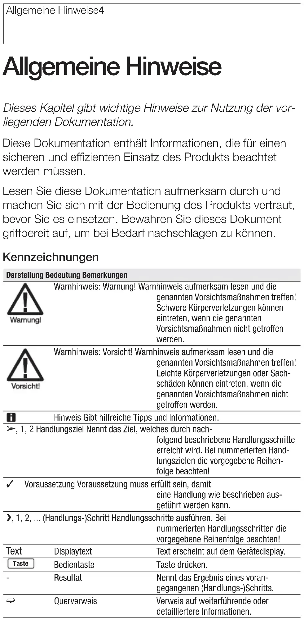 deenfresitptsvnl????Allgemeine Hinweise4 Allgemeine Hinweise Dieses Kapitel gibt wichtige Hinweise zur Nutzung der vor- liegenden Dokumentation. Diese Dokumentation enthält Informationen, die für einen sicheren und effizienten Einsatz des Produkts beachtet werden müssen. Lesen Sie diese Dokumentation aufmerksam durch und machen Sie sich mit der Bedienung des Produkts vertraut, bevor Sie es einsetzen. Bewahren Sie dieses Dokument griffbereit auf, um bei Bedarf nachschlagen zu können. Kennzeichnungen Darstellung Bedeutung Bemerkungen Warnhinweis: Warnung! Warnhinweis aufmerksam lesen und die genannten Vorsichtsmaßnahmen treffen! Schwere Körperverletzungen können eintreten, wenn die genannten Vorsichtsmaßnahmen nicht getroffen werden. Warnhinweis: Vorsicht! Warnhinweis aufmerksam lesen und die genannten Vorsichtsmaßnahmen treffen! Leichte Körperverletzungen oder Sach- schäden können eintreten, wenn die genannten Vorsichtsmaßnahmen nicht getroffen werden. Hinweis Gibt hilfreiche Tipps und Informationen. ±, 1, 2 Handlungsziel Nennt das Ziel, welches durch nach- folgend beschriebene Handlungsschritte erreicht wird. Bei nummerierten Hand- lungszielen die vorgegebene Reihen- folge beachten! Voraussetzung Voraussetzung muss erfüllt sein, damit eine Handlung wie beschrieben aus- geführt werden kann. i, 1, 2, ... (Handlungs-)Schritt Handlungsschritte ausführen. Bei nummerierten Handlungsschritten die vorgegebene Reihenfolge beachten! Text Displaytext Text erscheint auf dem Gerätedisplay. Bedientaste Taste drücken. - Resultat Nennt das Ergebnis eines voran- gegangenen (Handlungs-)Schritts. º Querverweis Verweis auf weiterführende oder detailliertere Informationen. Taste1. Sicherheitshinweise 5