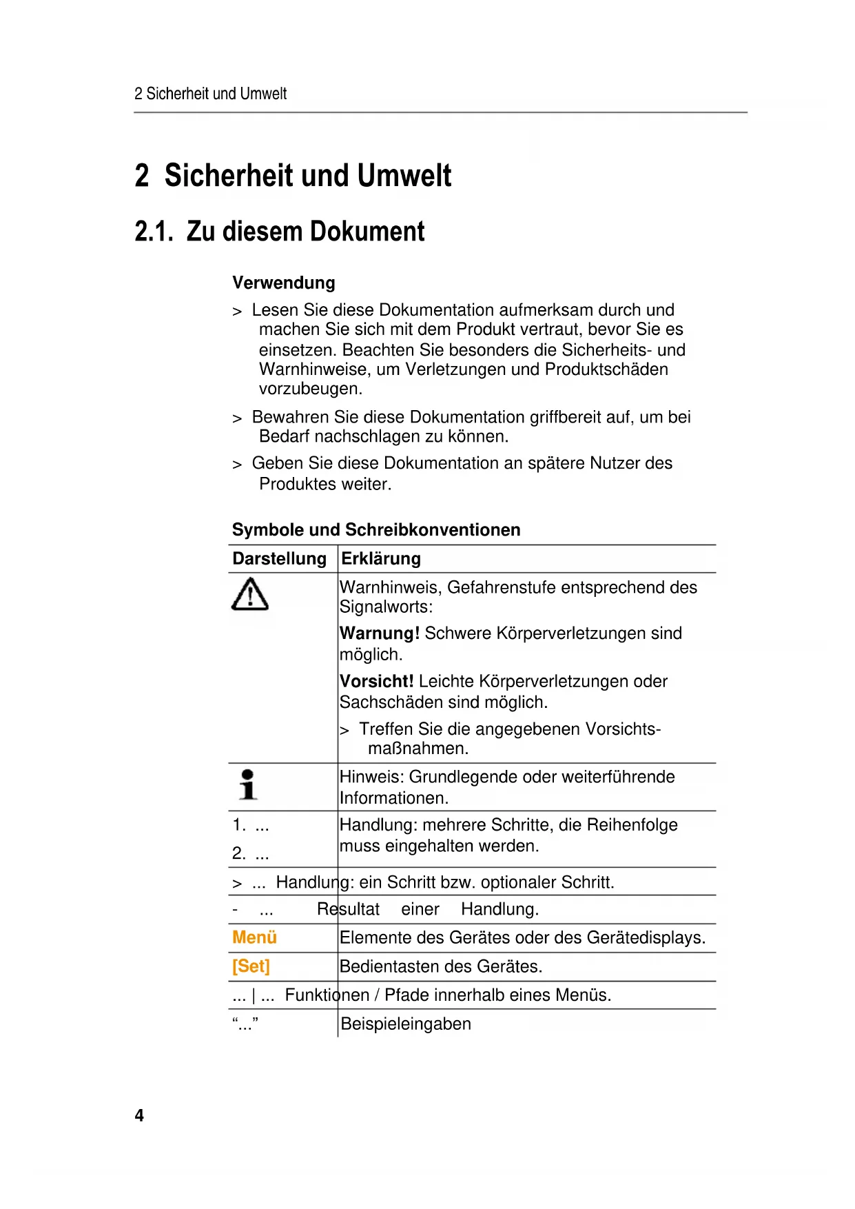 Handlung: mehrere Schritte, die Reihenfolge muss eingehalten werden. > ... Handlung: ein Schritt bzw. optionaler Schritt. - ... Resultat einer Handlung. Menü Elemente des Gerätes oder des Gerätedisplays. [Set] Bedientasten des Gerätes. ... | ... Funktionen / Pfade innerhalb eines Menüs. “...” Beispieleingaben2 Sicherheit und Umwelt