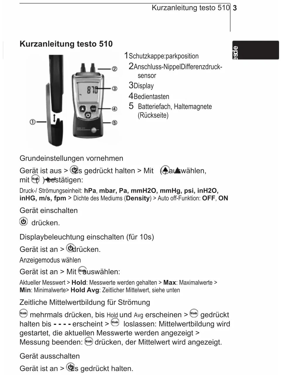 Kurzanleitung testo 510 1 Schutzkappe: parkposition 2 Anschluss-Nippel Differenzdruck- sensor 3 Display 4 Bedientasten 5 Batteriefach, Haltemagnete (Rückseite) Grundeinstellungen vornehmen Gerät ist aus > 2s gedrückt halten > Mit ( ) auswählen, mit ( ) bestätigen: Druck-/ Strömungseinheit: hPa, mbar, Pa, mmH2O, mmHg, psi, inH2O, inHG, m/s, fpm > Dichte des Mediums (Density) > Auto off-Funktion: OFF, ON Gerät einschalten drücken. Displaybeleuchtung einschalten (für 10s) Gerät ist an > drücken. Anzeigemodus wählen Gerät ist an > Mit auswählen: Aktueller Messwert > Hold: Messwerte werden gehalten > Max: Maximalwerte > Min: Minimalwerte> Hold Avg: Zeitlicher Mittelwert, siehe unten Zeitliche Mittelwertbildung für Strömung mehrmals drücken, bis Hold und Avg erscheinen > gedrückt halten bis - - - - erscheint > loslassen: Mittelwertbildung wird gestartet, die aktuellen Messwerte werden angezeigt > Messung beenden: drücken, der Mittelwert wird angezeigt. Gerät ausschalten Gerät ist an > 2s gedrückt halten.