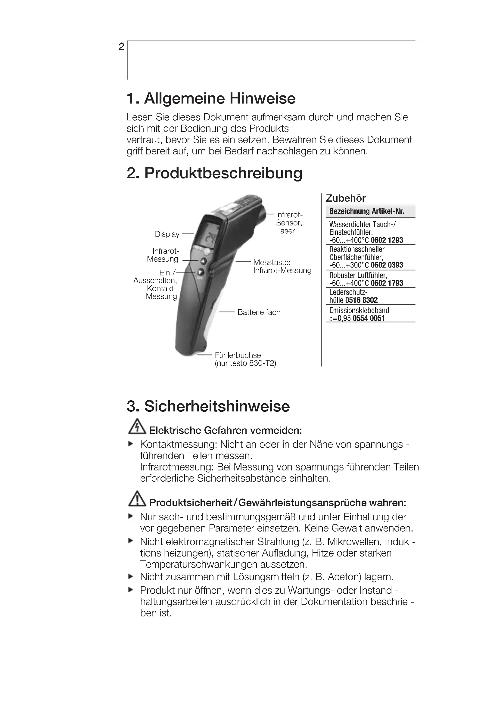 Elektrische Gefahren vermeiden: Kontaktmessung: Nicht an oder in der Nähe von spannungs - führenden Teilen messen. Infrarotmessung: Bei Messung von spannungs führenden Teilen erforderliche Sicherheitsabstände einhalten. Produktsicherheit / Gewährleistungsansprüche wahren: Nur sach- und bestimmungsgemäß und unter Einhaltung der vor gegebenen Parameter einsetzen. Keine Gewalt anwenden. Nicht elektromagnetischer Strahlung (z. B. Mikrowellen, Induk - tions heizungen), statischer Aufladung, Hitze oder starken Temperaturschwankungen aussetzen. Nicht zusammen mit Lösungsmitteln (z. B. Aceton) lagern. Produkt nur öffnen, wenn dies zu Wartungs- oder Instand - haltungsarbeiten ausdrücklich in der Dokumentation beschrie - ben ist. Infrarot- Sensor, Laser Batterie fach Display Ein-/ Ausschalten, Kontakt- Messung Messtaste: Infrarot-Messung Infrarot- Messung Fühlerbuchse (nur testo 830-T2) Zubehör Bezeichnung Artikel-Nr. Wasserdichter Tauch-/ Einstechfühler, -60...+400°C 0602 1293 Reaktionsschneller Oberflächenfühler, -60...+300°C 0602 0393 Robuster Luftfühler, -60...+400°C 0602 1793 Lederschutz- hülle 0516 8302 Emissionsklebeband ε =0,95 0554 00513 Laserstrahlung! Nicht in den Laserstrahl blicken. Fachgerecht entsorgen: Defekte Akkus / leere Batterien an den dafür vorgesehenen Sammelstellen abgeben. Produkt nach Ende der Nutzungszeit direkt an Testo senden. Wir sorgen für eine umwelt schonende Entsorgung.