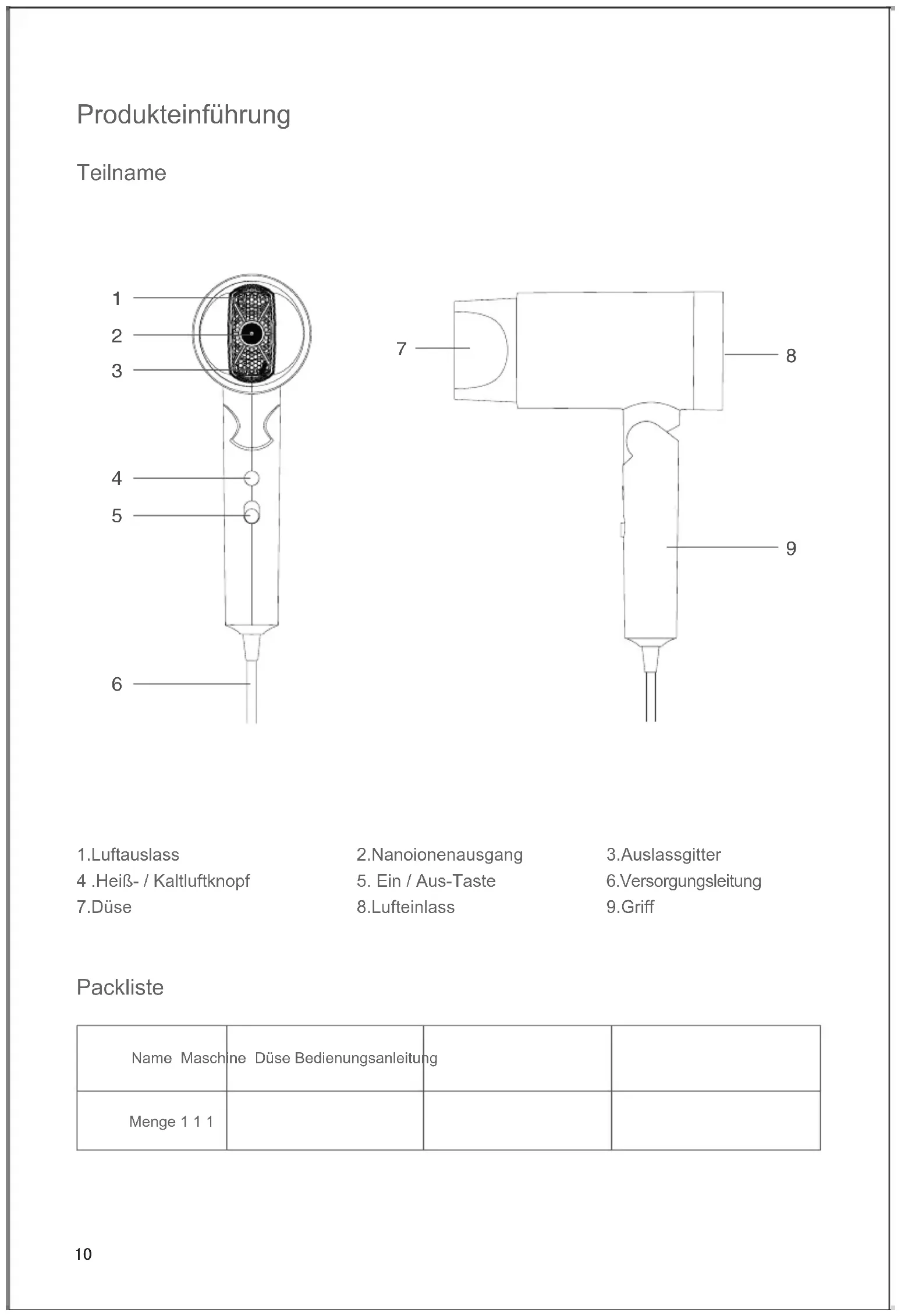8.Lufteinlass 3.Auslassgitter 6.Versorgungsleitung 9.Griff Packliste Name Maschine Düse BedienungsanleitungMenge 1 1 1