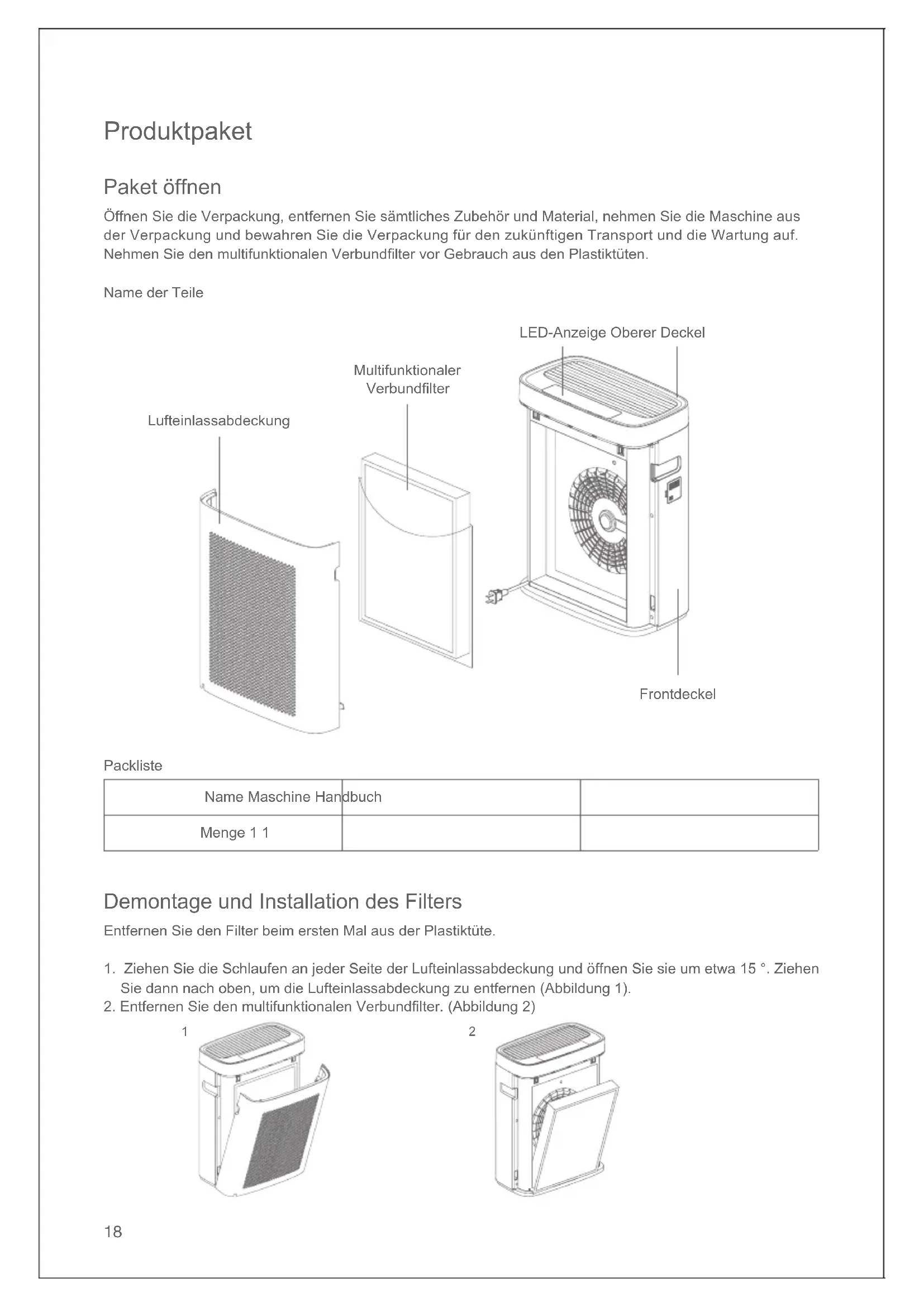 Hersteller und andere Fachleute. Probleme lösen Überprüfen Sie die folgenden Problempunkte, bevor Sie sie an die Wartungsabteilung delegieren. Probleme Mögliche Gründe Lösung Stromausfall Kein Strom an der Steckdose Untersuche die Kraft Der Netzstecker ist nicht richtig eingesteckt Stecken Sie die Stromleitung ein Es kommt keine Luft heraus Der Fremdkörper blockiert den Lufteinlass oder -auslass. Bewegen Sie die Maschine oder entfernen Sie Fremdkörper oder überprüfen Sie den Plastiklterbeutel, wenn er entfernt wurde Der Motor läuft nicht. Wenden Sie sich an den örtlichen Händler Schlechter Geruch aus dem Luftauslass Vorübergehend viel Geruch (viele Menschen rauchen usw.) Der Geruch verschwindet allmählich, nachdem die Maschine eine Weile eingeschaltet wurde. Ersetzen Sie den Filter nicht über einen längeren Zeitraum (eine andere Einsatzumgebung führt zu einer anderen Lebensdauer des Filters. Möglicherweise muss der Filter in einigen Monaten oder sogar Wochen trocknen oder ausgetauscht werden.) Stellen Sie den Filter für ca. 2-3 Stunden an einen sonnigen oder gut belüfteten Ort, um das Wasser zu verdampfen (setzen Sie ihn nicht der Sonne aus, um ihn auszusetzen, falls sich der Filter verformt und die Leistung der Maschine beeinträchtigt). Ersetzen Sie den Filter Alle Lichter sind aus, das Gerät wechselt automatisch in den Standby-Modus, wenn Licht im Raum ist Das Umgebungslicht ist klein, was den Lichtsensor beeinträchtigen und das Gerät in den Standby-Modus versetzen kann Stellen Sie die Maschine an einen helleren Ort. Das Gerät kann bei ausgeschaltetem Licht nicht in den Ruhemodus wechseln Offensichtliche Außenlichtquellen, die durch Türen und Fenster in den Raum gelangen, verhindern, dass die Maschine in den Ruhemodus wechselt Verhindern Sie das Eindringen von Lichtquellen wie das Schließen von Türen und Fenstern, das Ziehen von Vorhängen usw.24 Probleme Mögliche Gründe Lösung Die Luftqualitätsanzeige zeigt immer an, dass Rot die Farbe nicht ändert Luftauslass und Infrarot- Staubsensorlinse sind verschmutzt Reinigen Sie die oberen und unteren Lüftungsschlitze und die Linse mit Wattestäbchen Schlechte Reinigungswirkung In einem unbelüfteten Bereich, in dem sich Hindernisse in der Nähe der Maschine benden. Stellen Sie die Maschine in die belüftete Position und entfernen Sie die Hindernisse. Der multifunktionale Verbundfilter wurde lange Zeit nicht ersetzt Ersetzen Sie den multifunktionalen Verbundlter Hinweis: Wenn das Problem nach der Einführung der folgenden Lösungen weiterhin besteht, wenden Sie sich sofort an Ihren Kundendienst oder Händler vor Ort. Produktspezikation Parameter Modus AP36 Nennspannung 230V~ Nennfrequenz 50Hz Nennleistung 50W Partikel CADR 300m³/h Formaldehyd CADR 40m³/h Lärm 61dB(A) Geeigneter Arbeitsbereich 24m²-36 m² Schaltplan Infrarot- staubsen- sor Wechsel- strom- motor Steuerplatine Netzteilplatine 230V~50Hz25 Herstellerinformationen Entsorgung Maschine, Zubehöre und Verpackung sollten auf umweltfreundliche Weise recycelt werden. Bitte entsorgen Sie diese Maschine nicht im Hausmüll! Änderungen vorbehalten. Garantie Dieses Produkt genießt eine Zwei Jahre Garantie für die Maschine ab Kaufdatum. Von der Garantie sind ausgenommen: normale Abnutzung, kommerzielle Nutzung, Änderungen an dem gekauften Apparat, Reinigung, Konsequenzen von unsachgemäßen Verwendungen oder Schäden vom Käufer oder dritte Partei, und die sich auf äußerer Umstände beziehbare oder die von den Akkus verursachte Schäden. Hersteller Kingclean Electric Co., Ltd Adresse No.1 Straße Xiangyang, Bezirk New Suzhou, Provinz Jiangsu 215009, China26 Confezione del prodotto Apertura della confezione Aprire la confezione, rimuovere tutti gli accessori e il materiale. Estrarre la macchina dalla confezione e conservare la confezione per il trasporto e la manutenzione futuri. Estrarre il ltro composito multifunzionale dai sacchetti di plastica prima dell'uso. Nome delle parti Lista di imballaggio Nome Macchina Manuale d'uso Quantità 1 1 Rimozione e installazione del ltro Nota: Per la prima volta, assicurarsi di estrarre il ltro dal sacchetto di plastica.