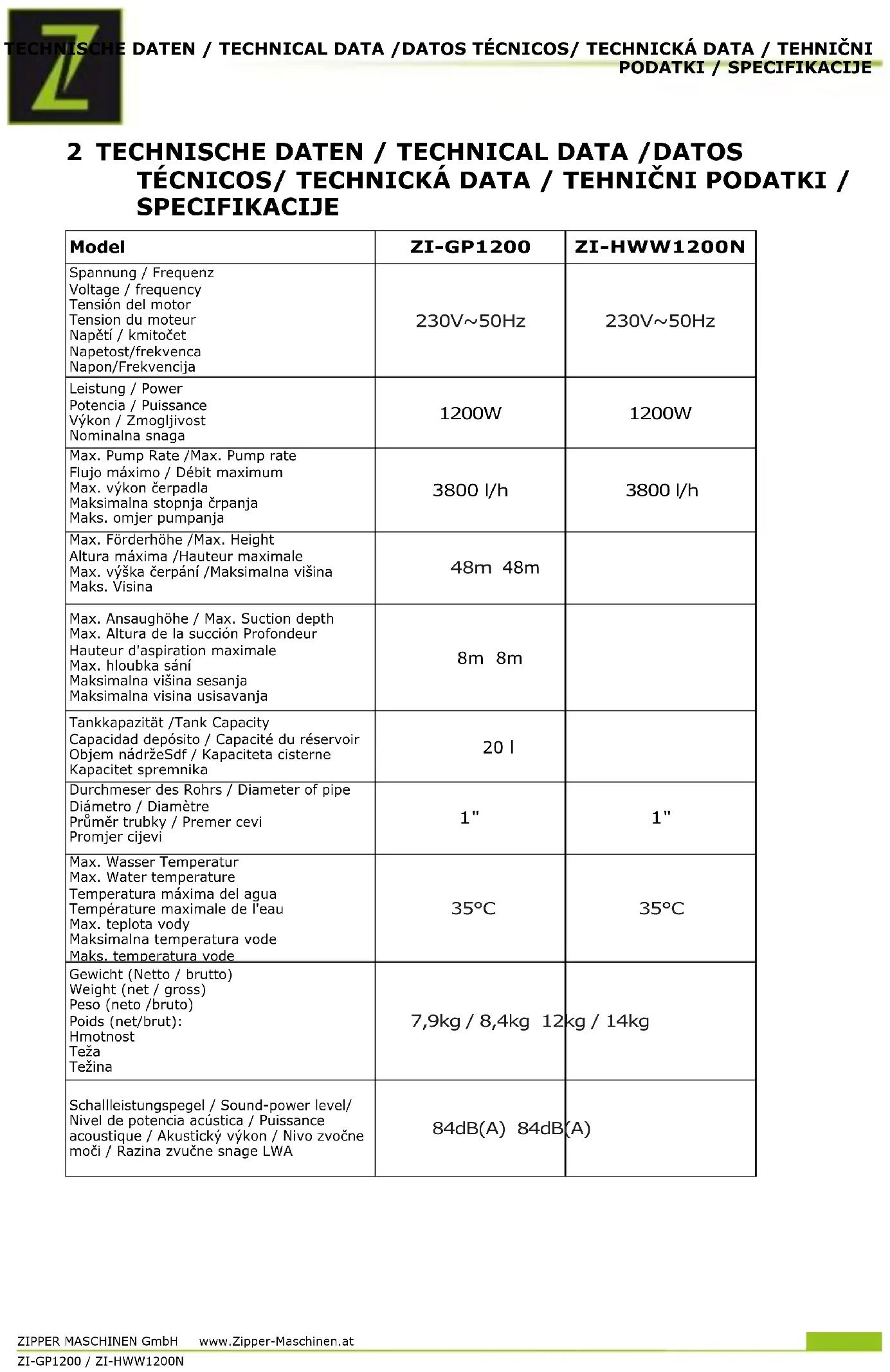 MASCHINEN GmbH 4707 Schlüsslberg, Gewerbepark 8, AUSTRIA Tel.: +43 7248 61116-700; Fax.: +43 7248 61116-720 www.zipper-maschinen.at info@zipper-maschinen.at Name / name / Naziv Gartenpumpe & Hauswasserwerk Bezeichnunge / Model / Tip