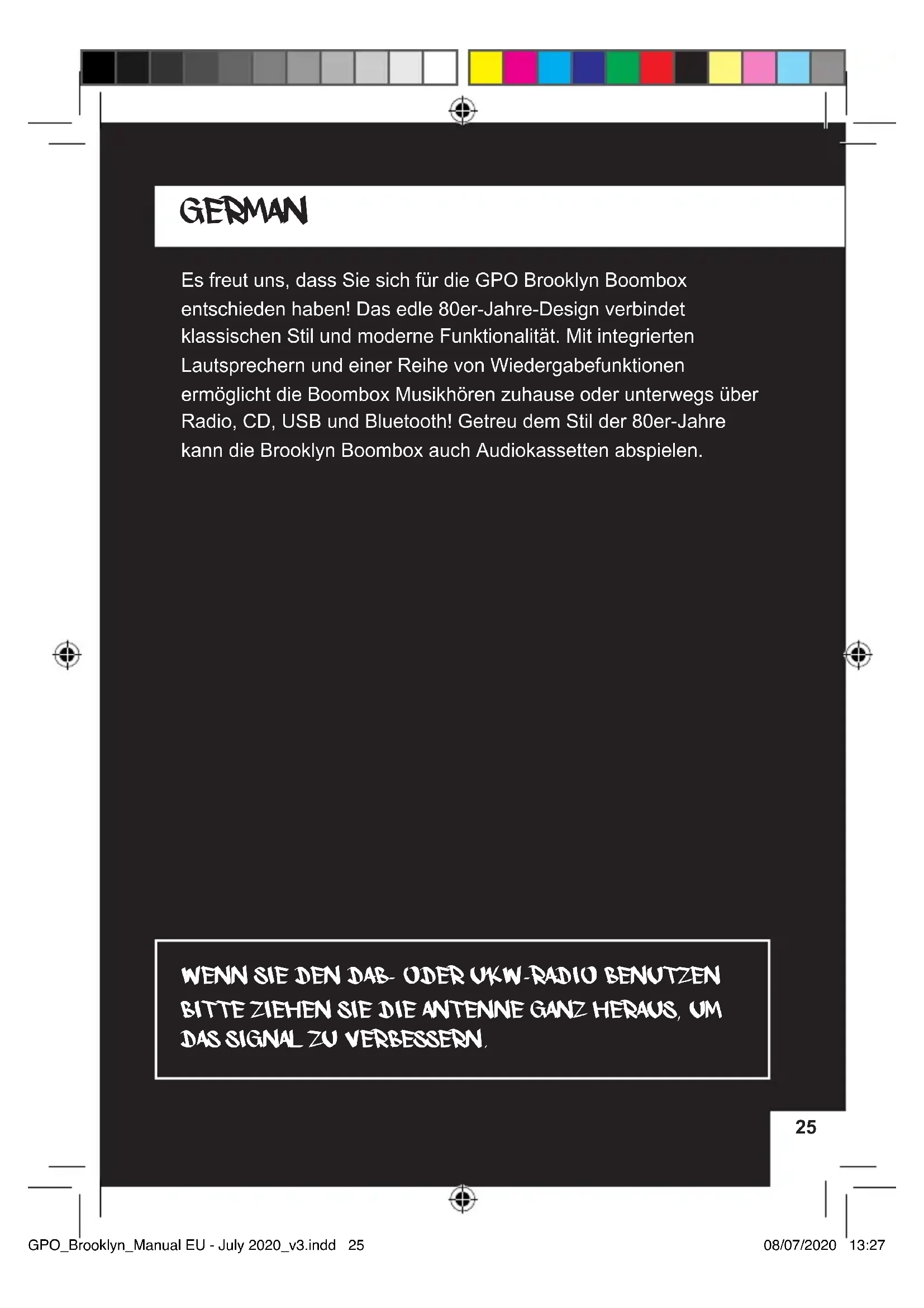GPO_Brooklyn_Manual EU - July 2020_v3.indd 22GPO_Brooklyn_Manual EU - July 2020_v3.indd 22 08/07/2020 13:2708/07/2020 13:2723 Troubleshooting No Power to the Device Make sure that the unit is fully charged and that the charging indicator is blue If not, please charge the device using the supplied charging cable. If your battery will not charge, contact GPO Retro directly for a replacement and instructions. DO NOT open the battery compartment without consulting us rst CD isn’t Reading If you have a CD read error, you may have inserted the CD the wrong way. Eject the CD and turn it so that the label side of the CD faces the rear of the unit. I Can’t Control the Music from the Unit If you are using the Bluetooth function, playback must be controlled from your paired device. CD and USB playback can be controlled from the main panel above the cassette slot, and tape playback from the tape control panel below the tape slot. I Can’t Find the Unit Using Bluetooth If a device is already paired to the unit and is within connection range, the unit may not appear in future Bluetooth scans. Try unpairing any other devices and try again. Need Further Help? Visit www.gporetro.com GPO_Brooklyn_Manual EU - July 2020_v3.indd 23GPO_Brooklyn_Manual EU - July 2020_v3.indd 23 08/07/2020 13:2708/07/2020 13:2724 GPO_Brooklyn_Manual EU - July 2020_v3.indd 24GPO_Brooklyn_Manual EU - July 2020_v3.indd 24 08/07/2020 13:2708/07/2020 13:272525 GERMAN Es freut uns, dass Sie sich für die GPO Brooklyn Boombox entschieden haben! Das edle 80er-Jahre-Design verbindet klassischen Stil und moderne Funktionalität. Mit integrierten Lautsprechern und einer Reihe von Wiedergabefunktionen ermöglicht die Boombox Musikhören zuhause oder unterwegs über Radio, CD, USB und Bluetooth! Getreu dem Stil der 80er-Jahre kann die Brooklyn Boombox auch Audiokassetten abspielen. Wenn Sie den DAB- oder UKW-Radio Benutzen Bitte ziehen Sie die Antenne ganz heraus, um das Signal zu verbessern. GPO_Brooklyn_Manual EU - July 2020_v3.indd 25GPO_Brooklyn_Manual EU - July 2020_v3.indd 25 08/07/2020 13:2708/07/2020 13:2726 Erste Schritte mit Ihrem GPO Brooklyn Entnehmen Sie das Gerät aus der Verpackung und stellen Sie es auf eine ache, stabile Oberäche. 1 – UK & EU 2 – UK 3 – EU Suchen Sie die 3 Kabelstücke, aus denen das Netzkabel besteht. Falls Sie glauben, eines dieser Stücke zu vermissen, überprüfen Sie bitte die Verpackung erneut, da sie sich manchmal im Polystyrol festsetzen. Identizieren Sie das Teil, das zu den Netzsteckdosen an Ihrem Wohnort passt (2 oder 3), und schließen Sie es an den Transformator an (1). Vergewissern Sie sich, dass die Batterie bereits installiert ist, indem Sie den Batteriefachdeckel auf der Rückseite des Geräts öffnen. Falls nicht, lesen Sie bitte unten unter Installieren einer Batterie in Ihrem Brooklyn nach. GPO_Brooklyn_Manual EU - July 2020_v3.indd 26GPO_Brooklyn_Manual EU - July 2020_v3.indd 26 08/07/2020 13:2708/07/2020 13:2727 Da die Batterie sich während des Transports wahrscheinlich entladen hat, müssen Sie mit dem Netzstrom beginnen. Schließen Sie also das Gleichstrom-Ende an der Rückseite des Brooklyn an, befestigen Sie den Stecker in der Steckdose und schalten Sie ihn an der Wand ein. Die LED-Anzeige sollte rot sein und anzeigen, dass Ihr Akku jetzt aufgeladen wird:: UK EU Für den regelmäßigen Gebrauch empfehlen wir, das Gerät so über Nacht aufzuladen und den Brooklyn tagsüber im Batteriebetrieb zu verwenden. Beachten Sie bitte: Um eine Batterie optimal aufzuladen, wird das DAB-Radio vorübergehend deaktiviert, solange die Batterie zu weniger als 75% aufgeladen ist. Wenn Sie es während dieser Zeit benutzen, kann es zu erheblichen Störungen kommen. GPO_Brooklyn_Manual EU - July 2020_v3.indd 27GPO_Brooklyn_Manual EU - July 2020_v3.indd 27 08/07/2020 13:2708/07/2020 13:2728 Verwendung der LED-Anzeige Die LED-Anzeige auf der Rückseite Ihres Brooklyn informiert Sie über den Ladestatus: Kein Licht - Ihr Brooklyn ist nicht an das Stromnetz angeschlossen; er läuft mit Batteri- estrom. Beachten Sie bitte, dass Ihre Batterieladung kritisch niedrig ist, wenn das Anzeigefeld blinkt. Rot - Ihr Brooklyn ist an das Stromnetz ang- eschlossen; eine Batterie ist installiert und wird geladen. Blau mit blinkendem Rotlicht - Ihr Brooklyn ist an das Stromnetz ang- eschlossen; es ist kein Akku installiert. Blau - Ihr Brooklyn ist an das Stromnetz angeschlossen; ein Akku ist installiert und vollständig aufgeladen. Er wird mit voller Ladung gehalten, darf aber nicht überladen werden. GPO_Brooklyn_Manual EU - July 2020_v3.indd 28GPO_Brooklyn_Manual EU - July 2020_v3.indd 28 08/07/2020 13:2708/07/2020 13:2729 Installieren einer Batterie in Ihrem Brooklyn Folgen Sie bitte der Reihenfolge, um eine Batterie in Ihrem GPO Brooklyn zu installieren: