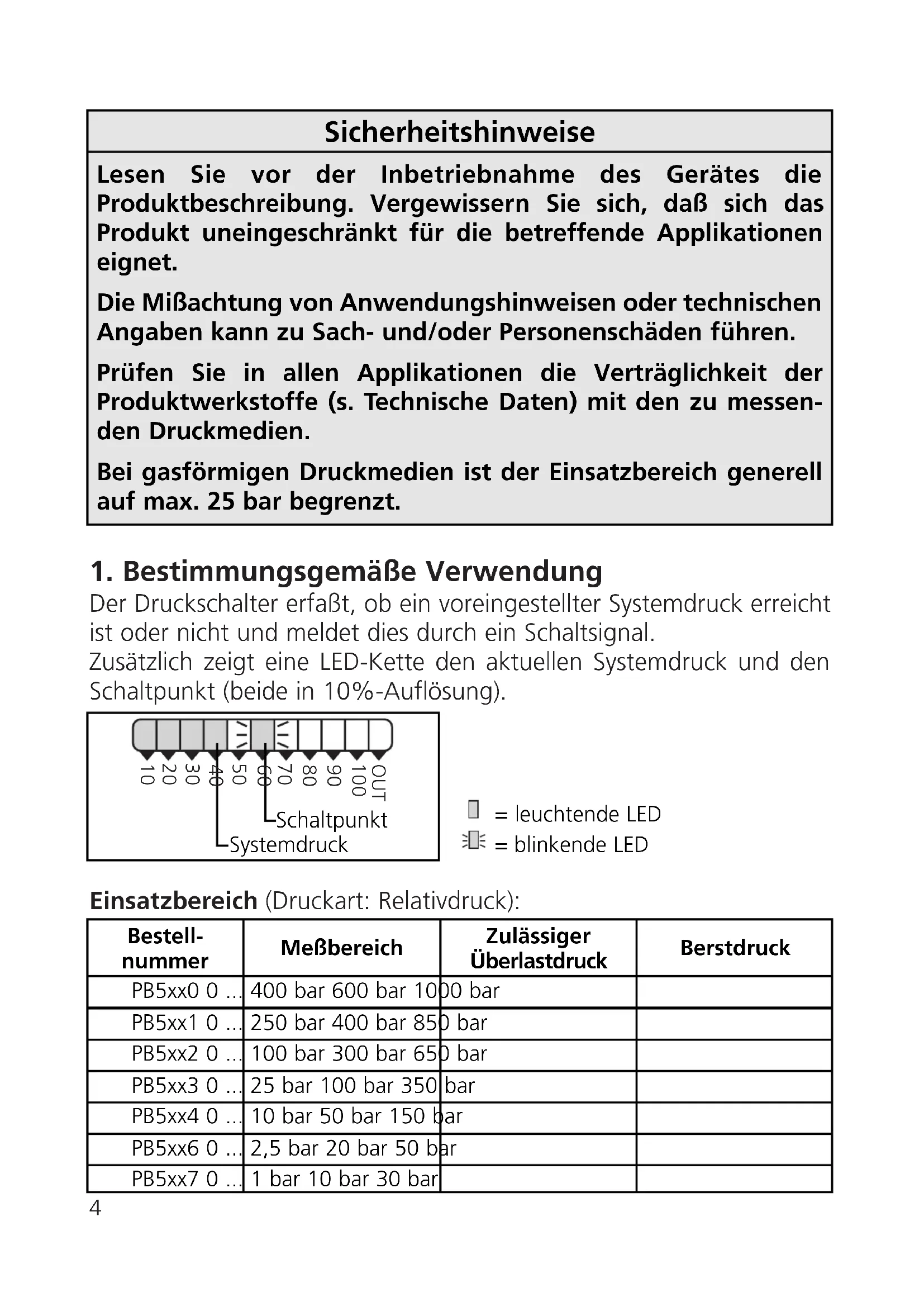 OUT 7,5bar + 2bar = 9,5bar PBxxx3 0 ... 25 bar1. Bestimmungsgemäße Verwendung Der Druckschalter erfaßt, ob ein voreingestellter Systemdruck erreicht ist oder nicht und meldet dies durch ein Schaltsignal. Zusätzlich zeigt eine LED-Kette den aktuellen Systemdruck und den Schaltpunkt (beide in 10%-Auflösung). Einsatzbereich (Druckart: Relativdruck):