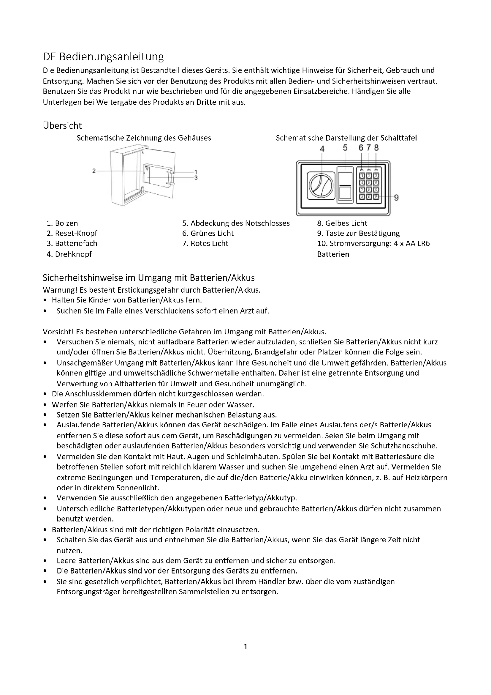 - Sie sind gesetzlich verpflichtet, Batterien/Akkus bei Ihrem Händler bzw. über die vom zuständigen Entsorgungsträger bereitgestellten Sammelstellen zu entsorgen.2 Verpackungsinhalt Prüfen Sie den Verpackungsinhalt des Tresors, bevor Sie den Tresor verwenden. Sollte etwas fehlen oder beschädigt sein, wenden Sie sich an unseren Service. 1x Tresor 2x Notschlüssel 1x Bedienungsanleitung Schlüsselanhänger