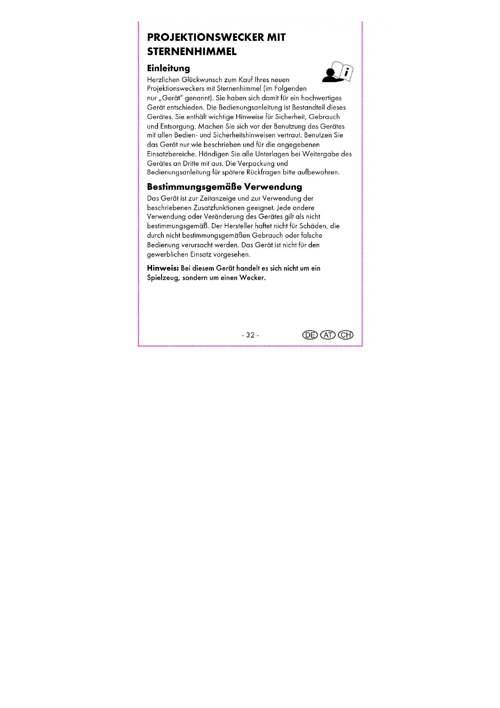 Supplier Please note that the following address is not a service address. Please first contact the service address (see above). digi-tech gmbh Valterweg 27A 65817 Eppstein GERMANY- 30 - Bedienungs- und Sicherheitshinweise Inhaltsverzeichnis Inhaltsverzeichnis .......................................................................... - 30 - Einleitung ....................................................................................... - 32 - Bestimmungsgemäße Verwendung ............................................. - 32 - Lieferumfang .................................................................................. - 33 - Technische Daten .......................................................................... - 33 - Zeichenerklärung .......................................................................... - 34 - Wichtige Sicherheitshinweise Wichtige SicherheitshinweiseWichtige Sicherheitshinweise Wichtige Sicherheitshinweise ................................................... - 35 - Sicherheitshinweise für Benutzer ........................................... - 35 - Das Gerät nicht in Kleinkinderhände geben ........................ - 36 - Sicherheitshinweise zu den Batterien .................................... - 37 - Das Gerät sicher aufstellen .................................................... - 39 - Bedienfelder .................................................................................. - 40 - Vorderseite .............................................................................. - 40 - Rückseite .................................................................................. - 41 - Display..................................................................................... - 42 - Inbetriebnahme ............................................................................. - 43 - Batterien einlegen ................................................................... - 43 - Uhrzeit und Datum einstellen ....................................................... - 44 - 12-/24-Stunden-Anzeige ..................................................... - 45 - Temperatur °C/°F ................................................................. - 45 - Melodie-Auswahl ................................................................... - 45 - Lautstärke ................................................................................ - 46 - Melodie abspielen ................................................................. - 46 -- 31 - Sternenprojektion ................................................................... - 47 - Alarm ............................................................................................. - 47 - Alarmeinstellung ..................................................................... - 47 - Alarm aktivieren oder deaktivieren ....................................... - 48 - Schlummerfunktion (SNOOZE) ............................................. - 49 - Timer .............................................................................................. - 49 - Timer einstellen ....................................................................... - 49 - Timer starten oder stoppen .................................................... - 50 - Display-Beleuchtung ..................................................................... - 50 - Reinigungshinweis ........................................................................ - 50 - Lagerung........................................................................................ - 51 - Vereinfachte EU-Konformitätserklärung ...................................... - 51 - Entsorgung..................................................................................... - 51 - Entsorgung des Elektrogeräts ................................................ - 52 - Entsorgung der Batterien ........................................................ - 54 - Recycling ................................................................................. - 56 - Müllentsorgung ....................................................................... - 56 - Garantie der digi-tech gmbh ....................................................... - 56 - Garantiebedingungen ........................................................... - 56 - Garantiezeit und gesetzliche Mängelansprüche................. - 57 - Garantieumfang ..................................................................... - 57 - Abwicklung im Garantiefall ................................................... - 58 - Service ........................................................................................... - 59 - Lieferant ......................................................................................... - 60 -- 32 - PROJEKTIONSWECKER MIT STERNENHIMMEL Einleitung Herzlichen Glückwunsch zum Kauf Ihres neuen Projektionsweckers mit Sternenhimmel (im Folgenden nur „Gerät“ genannt). Sie haben sich damit für ein hochwertiges Gerät entschieden. Die Bedienungsanleitung ist Bestandteil dieses Gerätes. Sie enthält wichtige Hinweise für Sicherheit, Gebrauch und Entsorgung. Machen Sie sich vor der Benutzung des Gerätes mit allen Bedien- und Sicherheitshinweisen vertraut. Benutzen Sie das Gerät nur wie beschrieben und für die angegebenen Einsatzbereiche. Händigen Sie alle Unterlagen bei Weitergabe des Gerätes an Dritte mit aus. Die Verpackung und Bedienungsanleitung für spätere Rückfragen bitte aufbewahren. Bestimmungsgemäße Verwendung Das Gerät ist zur Zeitanzeige und zur Verwendung der beschriebenen Zusatzfunktionen geeignet. Jede andere Verwendung oder Veränderung des Gerätes gilt als nicht bestimmungsgemäß. Der Hersteller haftet nicht für Schäden, die durch nicht bestimmungsgemäßen Gebrauch oder falsche Bedienung verursacht werden. Das Gerät ist nicht für den gewerblichen Einsatz vorgesehen. Hinweis: Bei diesem Gerät handelt es sich nicht um ein Spielzeug, sondern um einen Wecker.- 33 - Lieferumfang Hinweis: Bitte überprüfen 