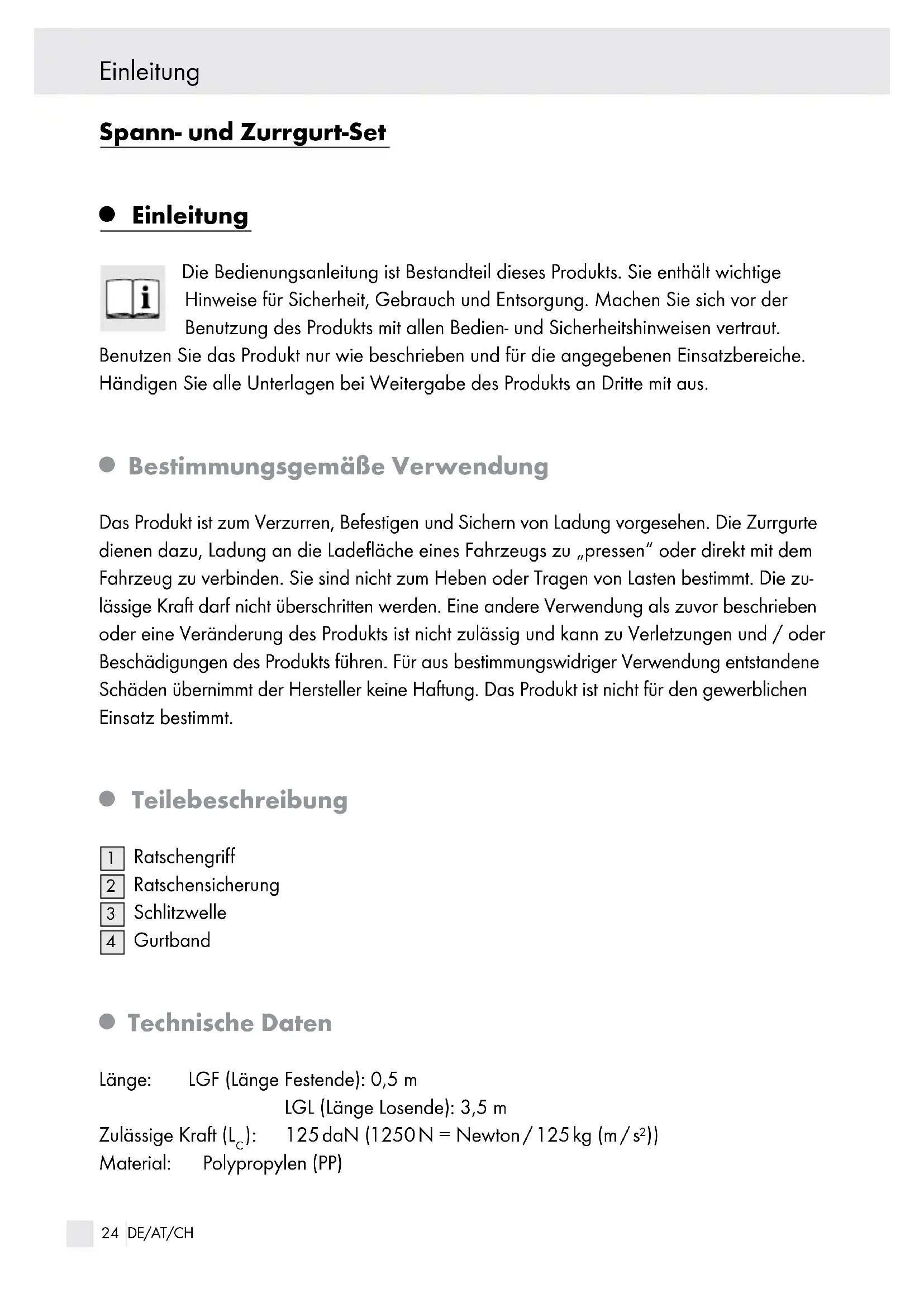 Bestimmungsgemäße Verwendung Das Produkt ist zum Verzurren, Befestigen und Sichern von Ladung vorgesehen. Die Zurrgurte dienen dazu, Ladung an die Ladefläche eines Fahrzeugs zu „pressen“ oder direkt mit dem Fahrzeug zu verbinden. Sie sind nicht zum Heben oder Tragen von Lasten bestimmt. Die zu- lässige Kraft darf nicht überschritten werden. Eine andere Verwendung als zuvor beschrieben oder eine Veränderung des Produkts ist nicht zulässig und kann zu Verletzungen und / oder Beschädigungen des Produkts führen. Für aus bestimmungswidriger Verwendung entstandene Schäden übernimmt der Hersteller keine Haftung. Das Produkt ist nicht für den gewerblichen Einsatz bestimmt.
