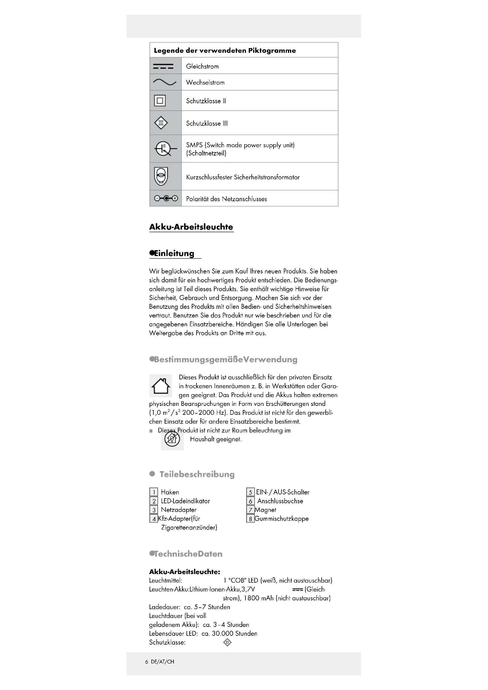 85 DE/AT/CH Legende der verwendeten Piktogramme ................................................................ Seite 6 Einleitung .......................................................................... Seite 6 Bestimmungsgemäße Verwendung ..................................... Seite 6 Teilebeschreibung ................................................................ Seite 6 Technische Daten ................................................................. Seite 6 Lieferumfang ......................................................................... Seite 7 Sicherheitshinweise ................................................. Seite 7 Vor dem Gebrauch ................................................... Seite 8 Produkt aufladen .................................................................. Seite 8 Gebrauch .......................................................................... Seite 9 Produkt ohne Stromanschluss verwenden .......................... Seite 9 Fehler beheben ........................................................... Seite 9 Wartung und Reinigung ...................................... Seite 9 Entsorgung ...................................................................... Seite 10 Garantie ............................................................................ Seite 106 DE/AT/CH Legende der verwendeten Piktogramme Gleichstrom Wechselstrom Schutzklasse II Schutzklasse III SMPS (Switch mode power supply unit) (Schaltnetzteil) Kurzschlussfester Sicherheitstransformator Polarität des Netzanschlusses Akku-Arbeitsleuchte Einleitung Wir beglückwünschen Sie zum Kauf Ihres neuen Produkts. Sie haben sich damit für ein hochwertiges Produkt entschieden. Die Bedienungs- anleitung ist Teil dieses Produkts. Sie enthält wichtige Hinweise für Sicherheit, Gebrauch und Entsorgung. Machen Sie sich vor der Benutzung des Produkts mit allen Bedien- und Sicherheitshinweisen vertraut. Benutzen Sie das Produkt nur wie beschrieben und für die angegebenen Einsatzbereiche. Händigen Sie alle Unterlagen bei Weitergabe des Produkts an Dritte mit aus. Bestimmungsgemäße Verwendung Dieses Produkt ist ausschließlich für den privaten Einsatz in trockenen Innenräumen z. B. in Werkstätten oder Gara- gen geeignet. Das Produkt und die Akkus halten extremen physischen Beanspruchungen in Form von Erschütterungen stand (1,0 m