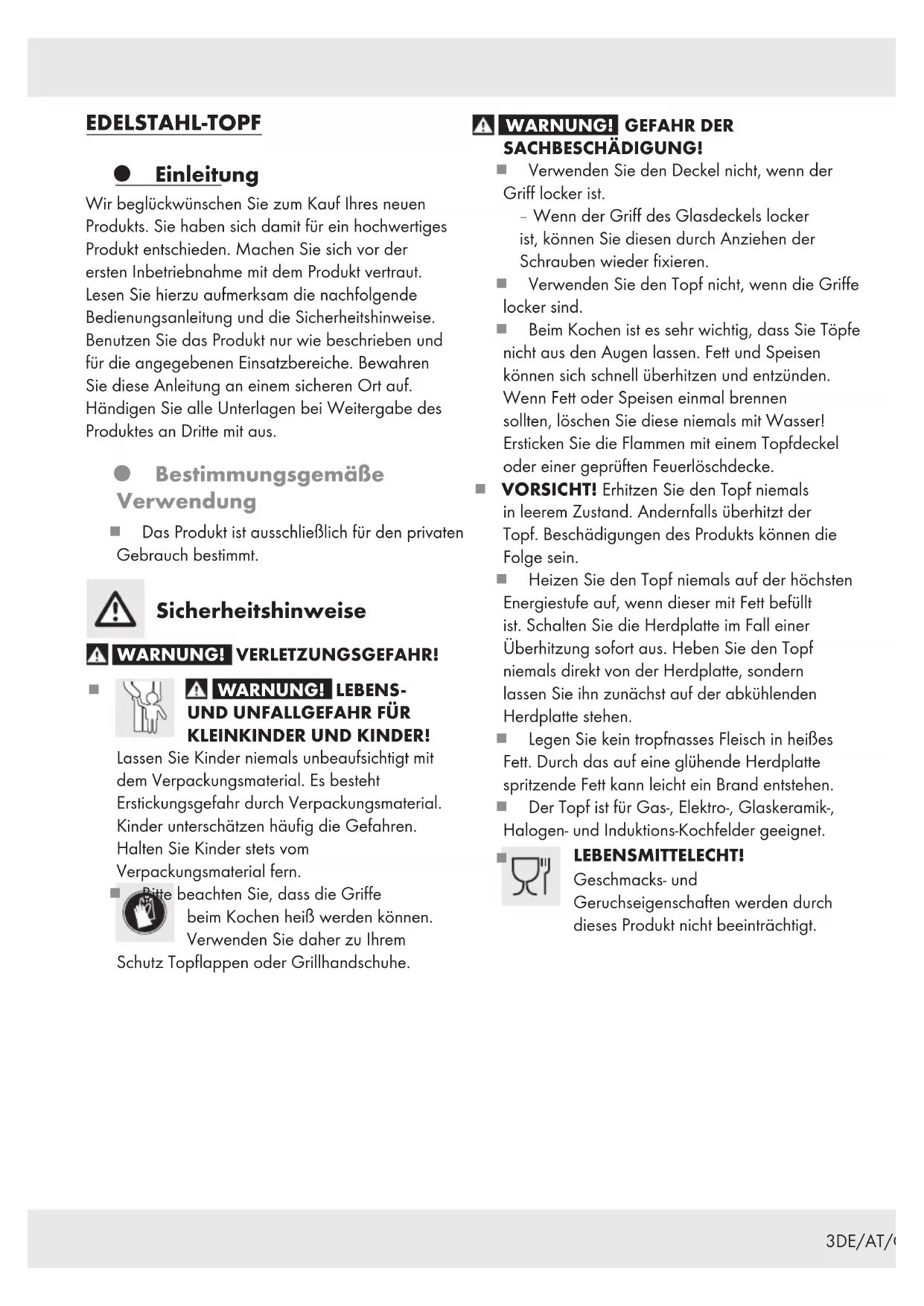 IAN 366364_2101 IAN 366380_2101 IAN 366372_2101DE/AT/CH Bedienungs- und Sicherheitshinweise Seite 3 GB/IE Operation and safety notes Page 6 FR/BE Instructions d‘utilisation et consignes de sécurité Page 9 NL/BE Bedienings- en veiligheidsinstructies Pagina 13 PL Wskazówki dotyczące obsługi i bezpieczeństwa Strona 16 CZ Pokyny pro obsluhu a bezpečnostní pokyny Strana 19 SK Pokyny pre obsluhu a bezpečnostné pokyny Strana 22 ES Instrucciones de utilización y de seguridad Página 25 DK Brugs- og sikkerhedsanvisninger Side 283DE/AT/CH EDELSTAHL-TOPF Einleitung Wir beglückwünschen Sie zum Kauf Ihres neuen Produkts. Sie haben sich damit für ein hochwertiges Produkt entschieden. Machen Sie sich vor der ersten Inbetriebnahme mit dem Produkt vertraut. Lesen Sie hierzu aufmerksam die nachfolgende Bedienungsanleitung und die Sicherheitshinweise. Benutzen Sie das Produkt nur wie beschrieben und für die angegebenen Einsatzbereiche. Bewahren Sie diese Anleitung an einem sicheren Ort auf. Händigen Sie alle Unterlagen bei Weitergabe des Produktes an Dritte mit aus. Bestimmungsgemäße Verwendung Das Produkt ist ausschließlich für den privaten Gebrauch bestimmt. Sicherheitshinweise WARNUNG! VERLETZUNGSGEFAHR! WARNUNG! LEBENS-