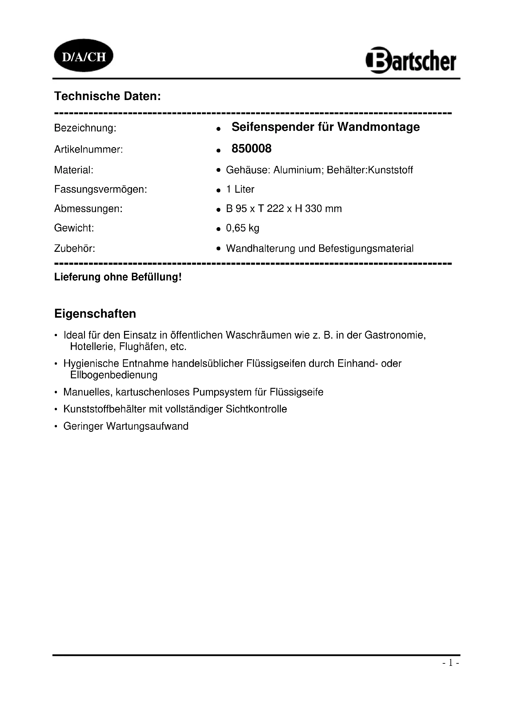 850008 - Seifenspender BARTSCHER - Kostenlose Bedienungsanleitung