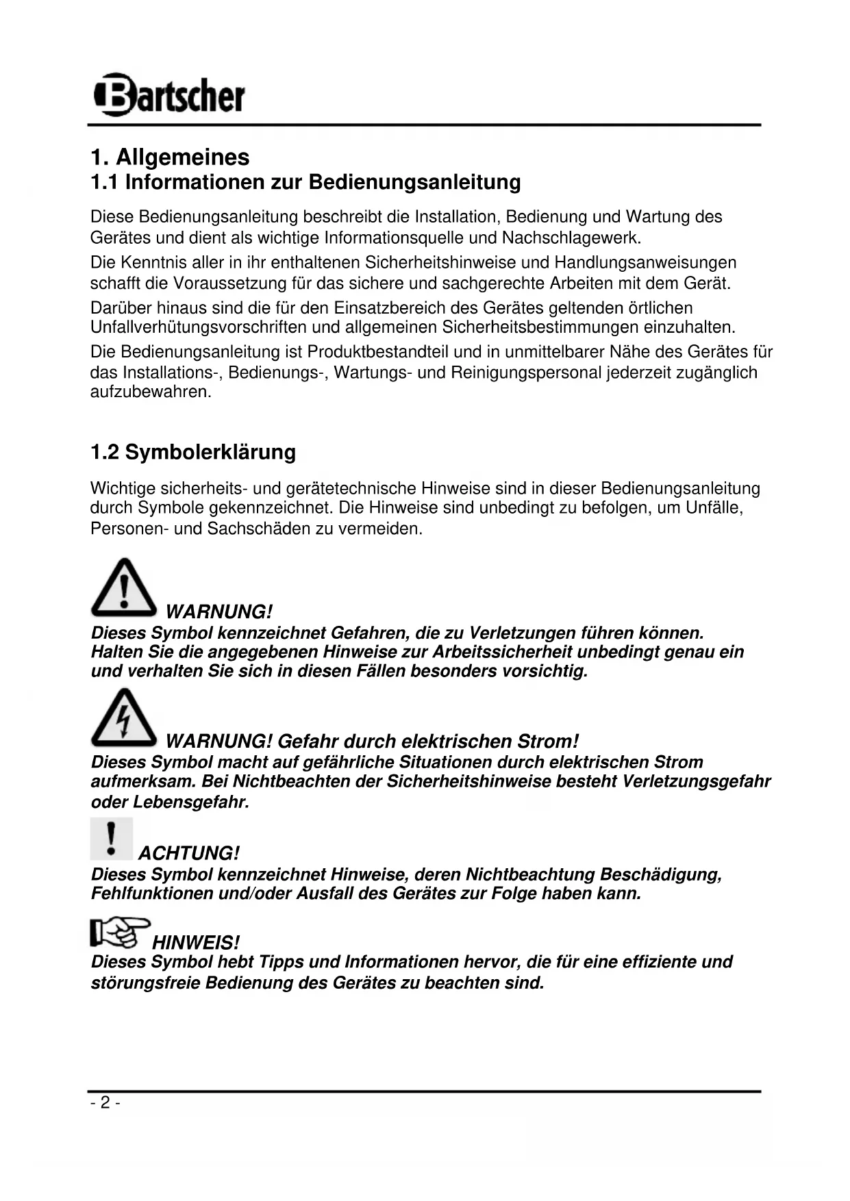 Diese Bedienungsanleitung beschreibt die Installation, Bedienung und Wartung des Gerätes und dient als wichtige Informationsquelle und Nachschlagewerk. Die Kenntnis aller in ihr enthaltenen Sicherheitshinweise und Handlungsanweisungen schafft die Voraussetzung für das sichere und sachgerechte Arbeiten mit dem Gerät. Darüber hinaus sind die für den Einsatzbereich des Gerätes geltenden örtlichen Unfallverhütungsvorschriften und allgemeinen Sicherheitsbestimmungen einzuhalten. Die Bedienungsanleitung ist Produktbestandteil und in unmittelbarer Nähe des Gerätes für das Installations-, Bedienungs-, Wartungs- und Reinigungspersonal jederzeit zugänglich aufzubewahren.