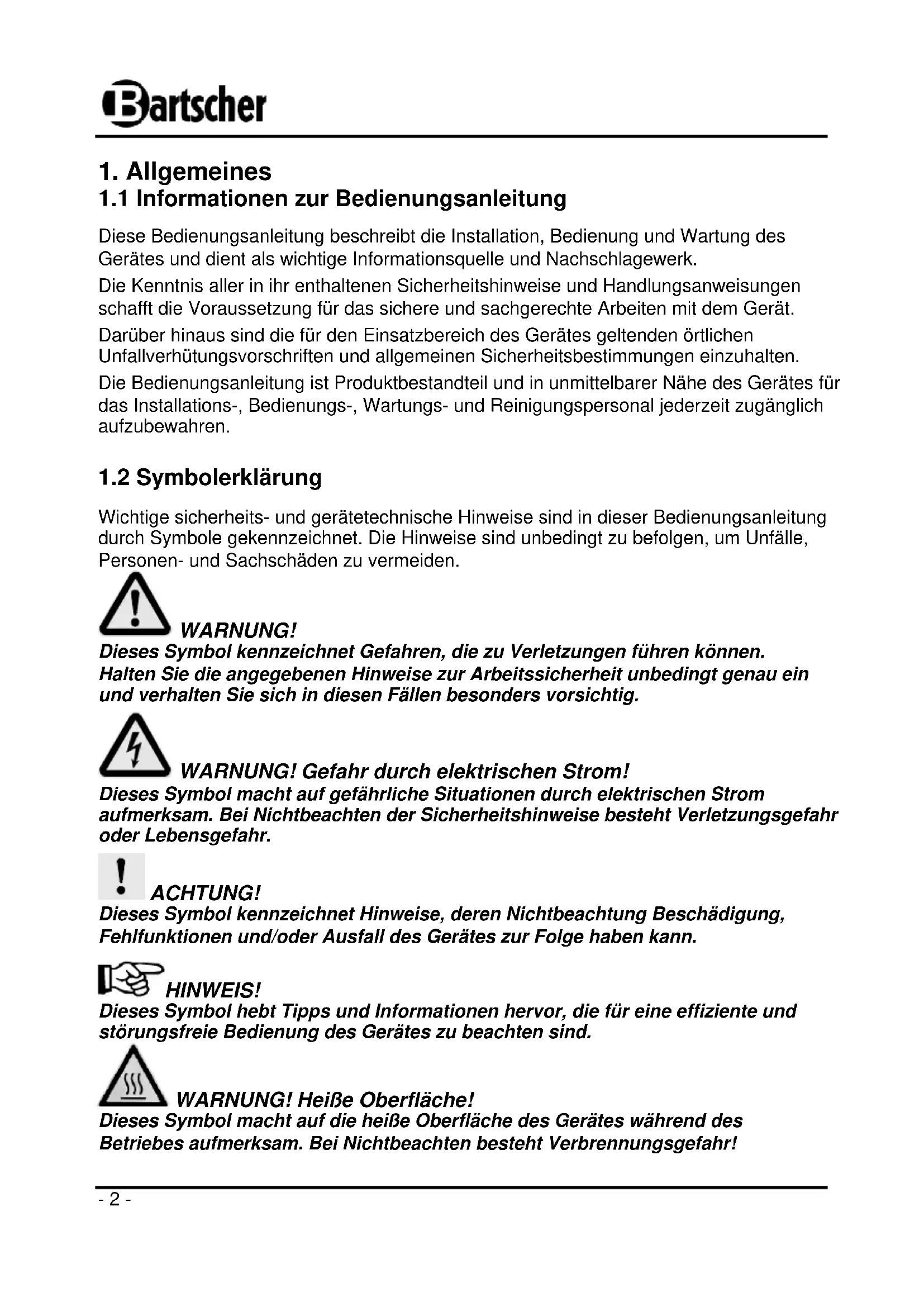 Diese Bedienungsanleitung beschreibt die Installation, Bedienung und Wartung des Gerätes und dient als wichtige Informationsquelle und Nachschlagewerk. Die Kenntnis aller in ihr enthaltenen Sicherheitshinweise und Handlungsanweisungen schafft die Voraussetzung für das sichere und sachgerechte Arbeiten mit dem Gerät. Darüber hinaus sind die für den Einsatzbereich des Gerätes geltenden örtlichen Unfallverhütungsvorschriften und allgemeinen Sicherheitsbestimmungen einzuhalten. Die Bedienungsanleitung ist Produktbestandteil und in unmittelbarer Nähe des Gerätes für das Installations-, Bedienungs-, Wartungs- und Reinigungspersonal jederzeit zugänglich aufzubewahren.